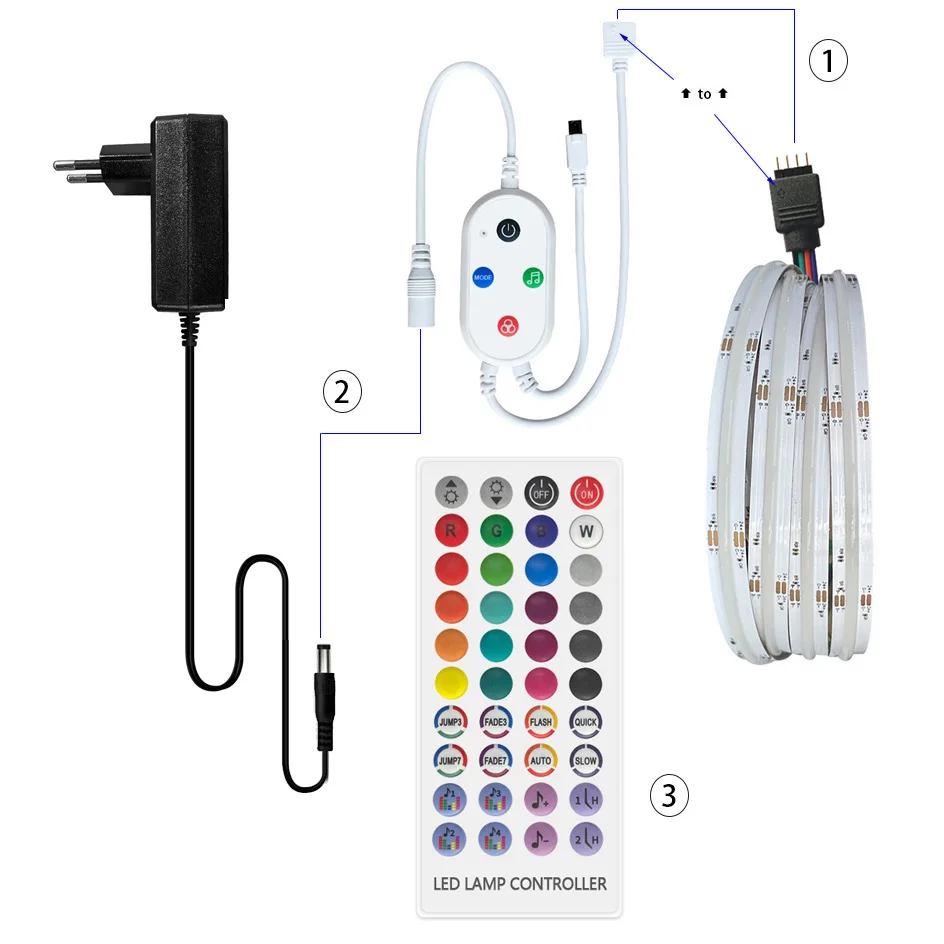 Подключи и работай, полный комплект, не беспокойтесь о подключении кабелейИзменяемый цвет, соответствует вашему RGB контроллеру,Вся полоса загорается один и тот же цвет одновременноУправление мобильным телефоном, синхронизация музыки, синхронизация микрофона, дистанционное управление