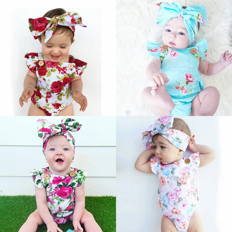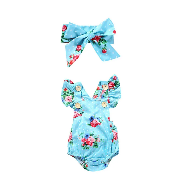 Детская одежда для новорожденных девочек с цветочным принтом; Футболки с короткими рукавами и круглым вырезом боди и повязка на голову с бантом; Комплект из 2 предметов для младенцев милый повседневный комплект летней одежды