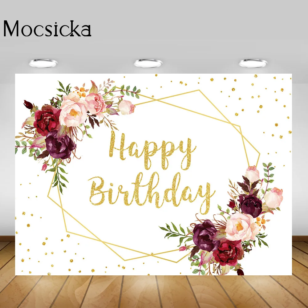 Акварель Цветы и птицы с днем рождения фон золотистого цвета с цветочным рисунком, на белом фоне День рождения торт стол реквизит для фотосессии