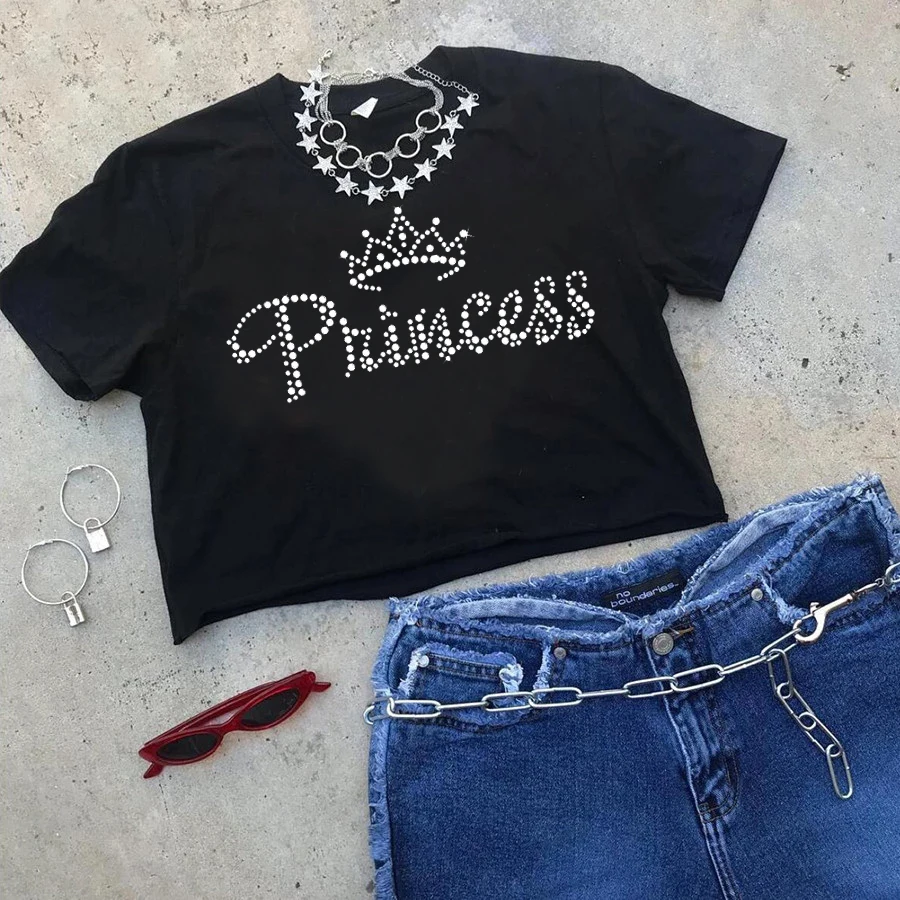 Женская Блестящая футболка FIXSYS с коротким рукавом, черная футболка с короной и надписью, расшитая стразами