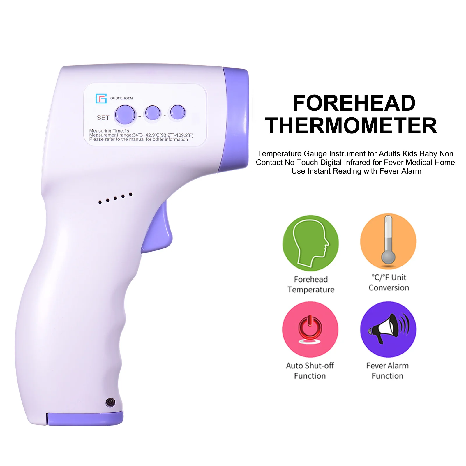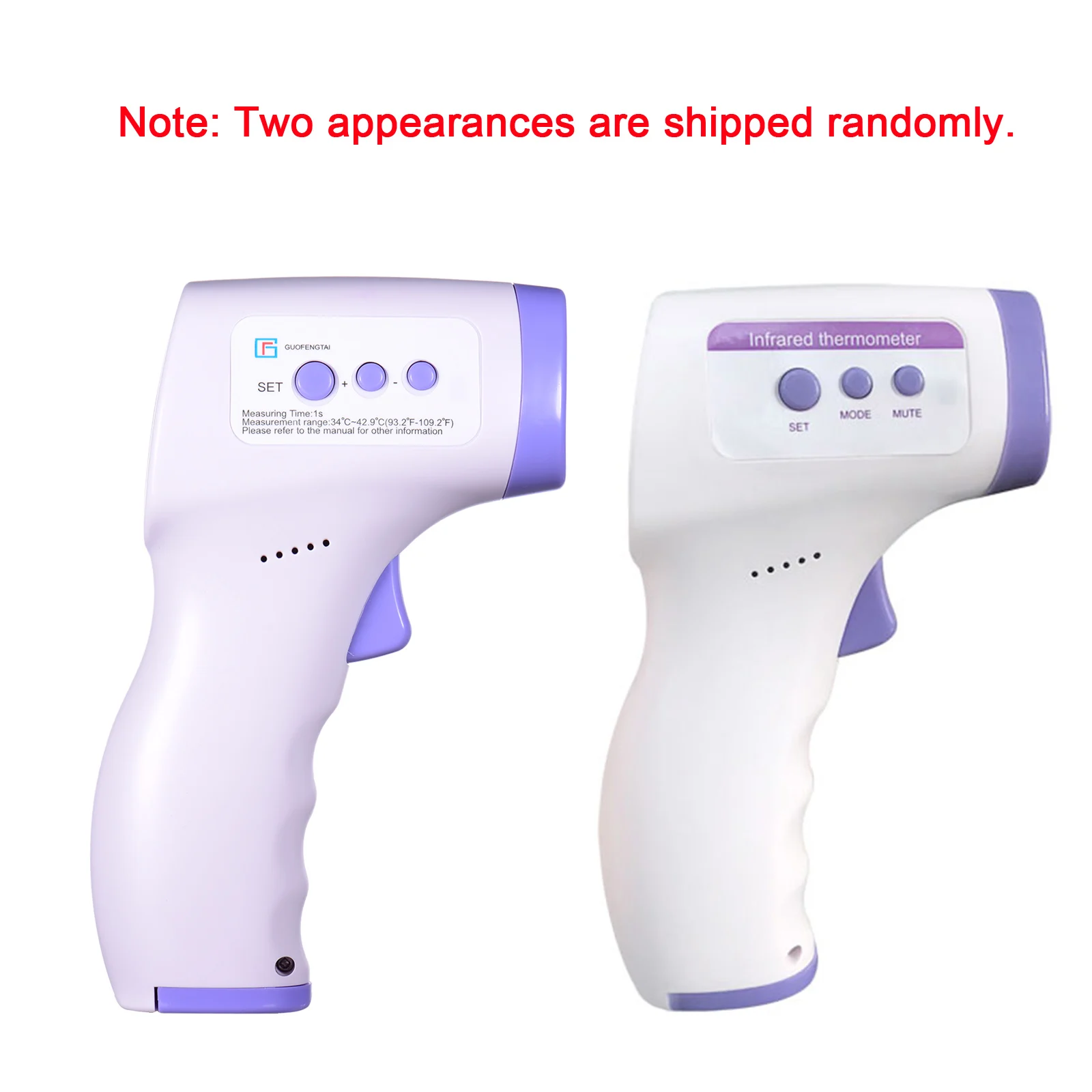 Примечание: два вида инфракрасного термометра поставляются случайным образом.* Бесконтактное измерение температуры тела с высокой точностью.* Опционально переключать между температурой человеческого тела и температурой поверхности.* Кабриолет между °C и °F. Можно установить значение сигнала тревоги.* ЖК-дисплей с обратной стороны-светильник для использования в темное время суток. Автоматическое сохранение данных и отключение питания.* Последние 32 новых измеренных данных могут храниться.* Светодиодный дисплей с подсветкой, прозрачный дисплей. 3 цвета подсветки дисплея информируют вас о различных ситуациях тела.* С функцией будильника.Характеристики инфракрасного термометра:Название продукта: инфракрасный термометрИсточник питания: DC3V, 2 * батарейки типа "ААА" (не входит в комплект)Потребляемая мощность: ≤ 150 мВтРежим измерения: режим лба (Бесконтактный)Диапазон измерения: режим температуры тела: 32 °C-42,9 °C(± 0,2 °C/0,4 °F)Режим поверхности: 0-100 °C, 32-34,9 °C (± 0,1 °C/0,18 °F)Расстояние измерения: 3-5 смАвтоматическое выключение питания: ≤ 10 секундКлинические стабильность: не познее ± 0,3 °CРазрешение дисплея: 0,1 °C/0,1 °FПодсветка: ПоддержкаФункция памяти: 32 группы измерительных значений могут быть запоминаныРабочая среда: 10 °C-40 °C (50,0 °C-104 °C); Относительная влажность ≤ 85% RH