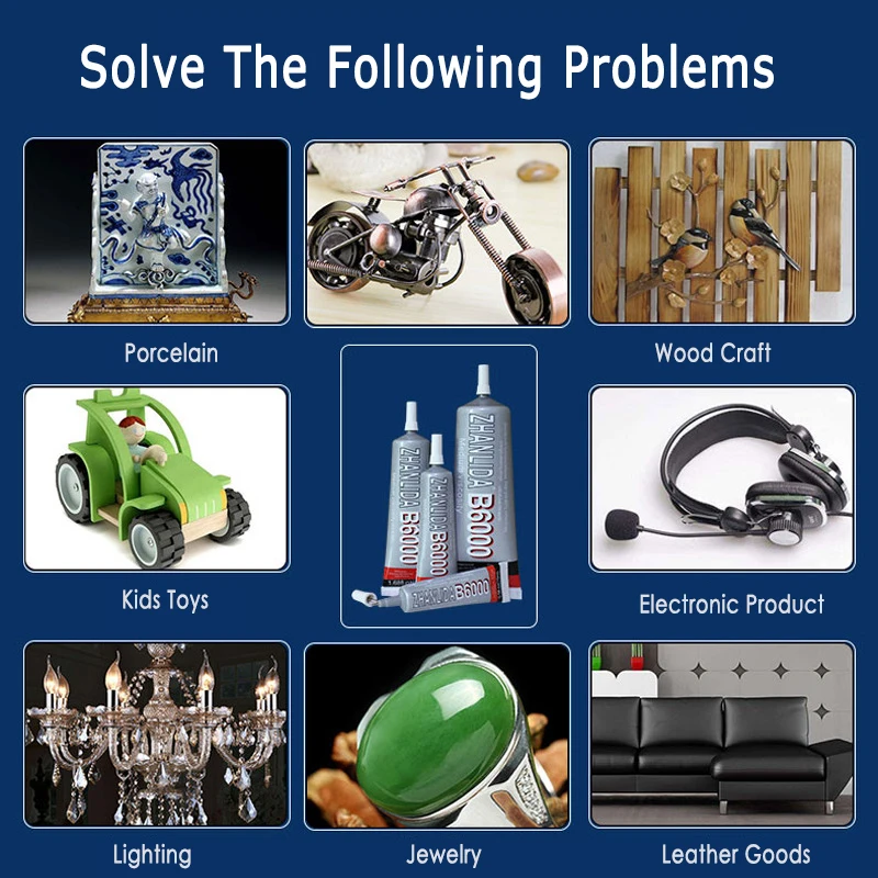 B6000 клей может вставить больше материала, он в металл, стекло, керамика, камень, бамбук, дерево, ткань, кожа, ПЭ, ПП, ПВХ, АБС, нейлон, пена, пленка, ткань, электронные компоненты, пластик, резина, волокно, бумага, мобильная рамка, ЖК-экран, В коробке, и другие материалы обладают хорошей адгезионной производительностью.