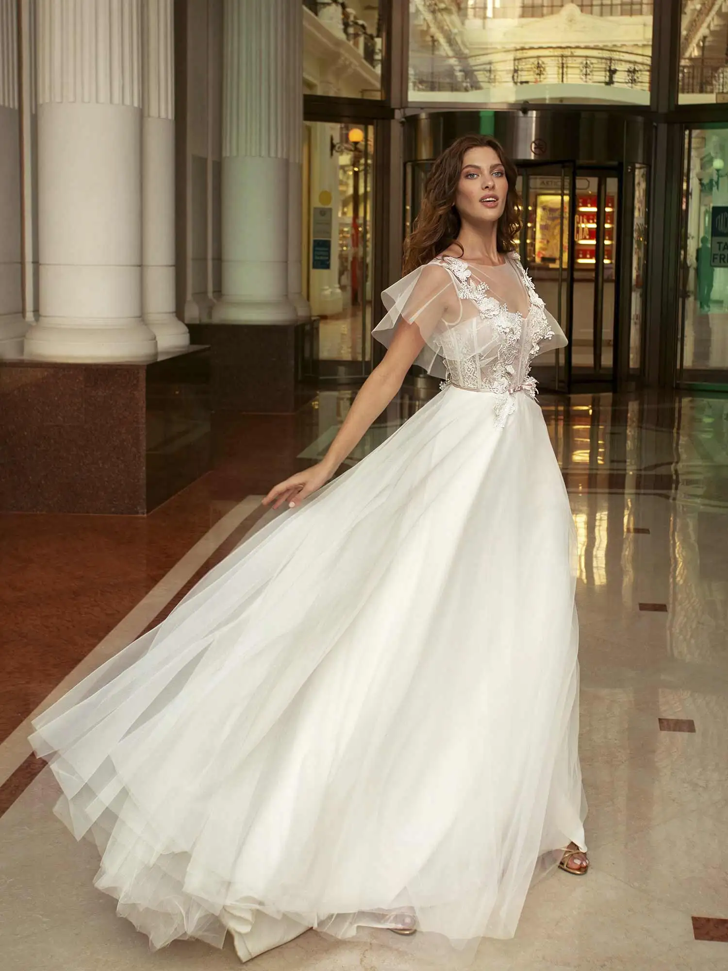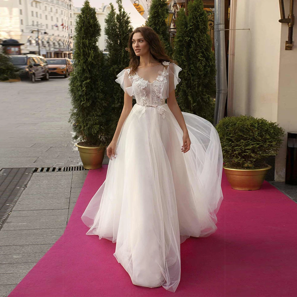 Платье Свадебное ТРАПЕЦИЕВИДНОЕ из тюля, с круглым вырезом и рукавами с оборками, на пуговицах, до пола