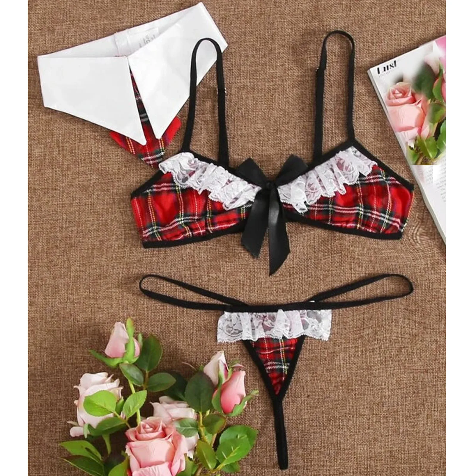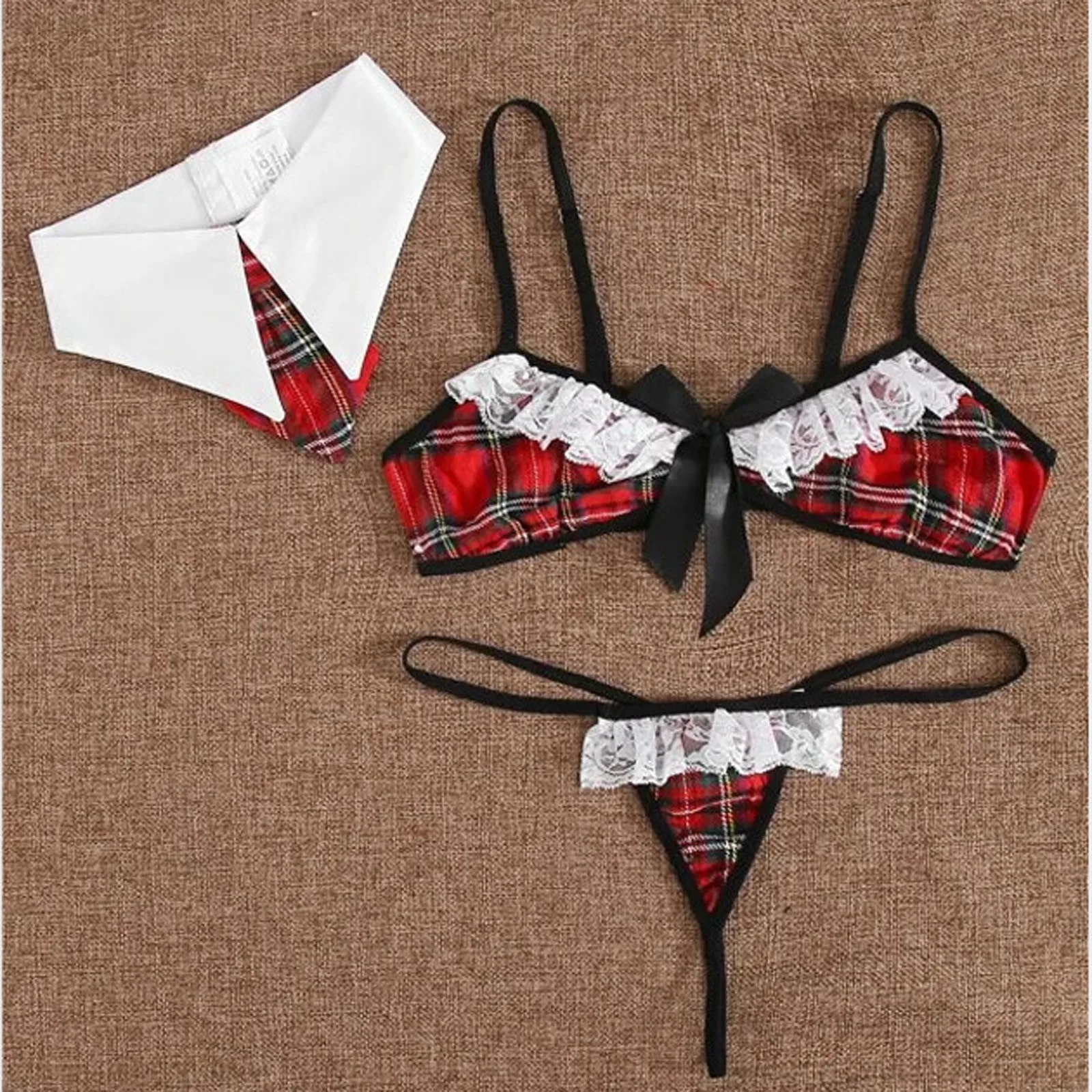 Женское сексуальное нижнее белье, 3 предмета, кружевной бюстгальтер в клеточку + стринги + Униформа на бретелях, пижамный комплект