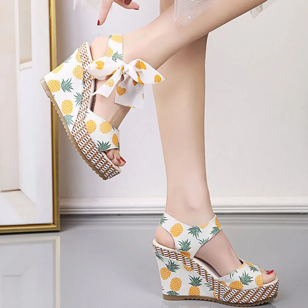 INSЖенская обувь на танкетке с цветочным принтом и бантом для отдых...