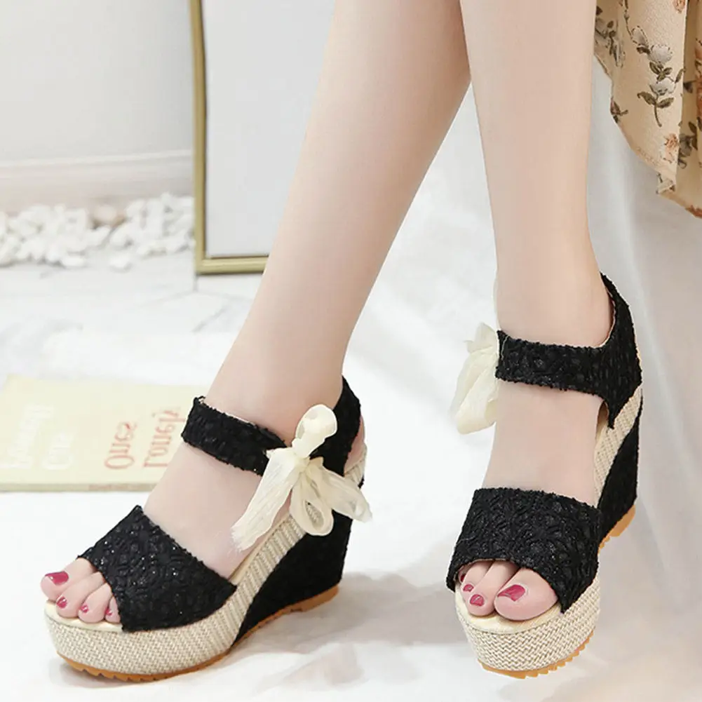 Женские босоножки на танкетке, с кружевом и высоким каблуком