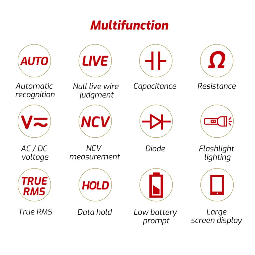 Этот ультратонкий мультиметр является автоматическим цифровым инструментом. Он оснащен четким большим экраном и функцией защиты от перегрузки. Движимый AAA 1,5 V одна батарея, может иметь разный метраж, стабилен, точный и надежный. Особенности: Возможность Тестирования постоянного/переменного напряжения, сопротивления, частоты, включения/выключения цепи и предлагает NCV обнаружения, нейтральной и живой идентификации провода. Оснащен 3,5-дюймовый большой экран, который показывает 5999 отсчетов четкие показания, легко читаемый. Ультратонкий дизайн, просто размер мобильного телефона, что делает его чрезвычайно портативным и легко носить с собой. Встроенный фонарик позволяет удобно использовать в ночное время или в темном уголке. Поставляется с защитным резиновым чехол для обеспечения долговечности Полезный инструмент для установки домашней цепи, ремонта электроники, обслуживания электрических объектов, ремонта автомобилей, ремонта бытовой техники. Характеристики: Материал: АБС-пластик Бренд: TASI Модель (опционально) TA804A TA804B Режим измерения Полностью автоматический Полностью автоматический и ручной Напряжение постоянного тока 0,9 V ~ 600V(0.8% ± 5) 0.1мв~ 600 В (0.8% ± 5) Напряжение переменного тока 0,9 V ~ 600V(1.0% ± 3) 1МВ~ 600 В (1.0% ± 3) Сопротивление 10 Ом ~ 60 МОМ (1.5% ± 2) 0.1Ω~ 60 МОМ (1.5% ± 2) Частота 40 Гц ~ 5999 Гц 40 Гц ~1 кГц Емкость N/A 1НФ ~ 60000 мкФ Диод N/A Да Экран дисплея Общий экран (3,5 дюйма) Цветной экран HD(3,5 дюйма) Звуковой сигнал On-off ≤ 50 Ом (голос) Датчик напряжения NCV Да Нейтральная и живая идентификация провода Да Измерение температуры окружающей среды 0 ℃ ~ 40 ℃ Фонарик Да Хранение данных Да Предупреждение низкого напряжения Да Подсказка о превышении диапазона OL Индикатор положительной и отрицательной полярности Да Аналоговая полоса Сегмент 21 Частота дискретизации Около 3 раз/сек Счетчик дисплея 5999 подсчетов Автоматическое отключение 10 мин Источник питания 1 батарея AAA (не входит в комплект) Товар Размеры: 148*76*19 мм/5,82*2,99 * 0.74in Вес изделия: 165 г/5,82 унций Вес посылка: 307 г/10,82 унций Посылка Размеры: 17,7*12*3,5 см/6,96*4,72 * 1.37in Упаковочный лист: 1 * Цифровой мультиметр 1 * отвертка 1 * пара выделенных тестовых проводов 1 * Руководство пользователя
