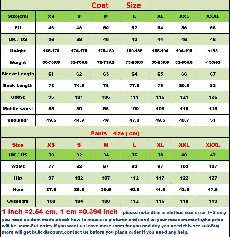 Сообщите нам размер куртки и размер штанов, которые могут вам помочь, и они подойдут Вам лучше. Пожалуйста, оставьте нам сообщение, чтобы мы могли вам помочь.