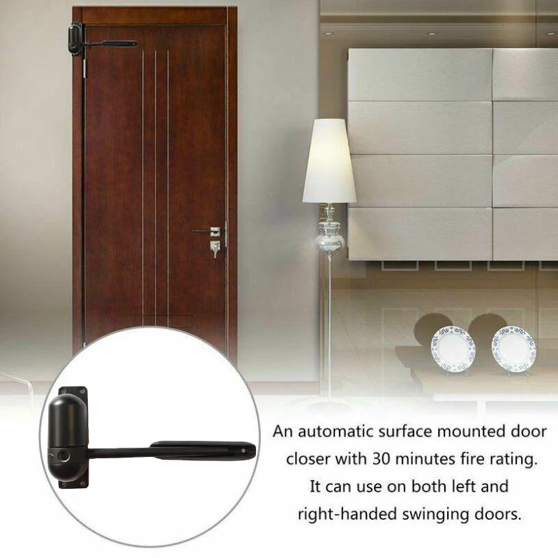 * Полностью регулируемый (подходит для левых и правых дверей) ближе имеет пружинное регулируемое натяжение* Закрывает двери до 68 кг-зацепление защелки в зависимости от условий* Автоматическая поверхностного монтажа доводчик с 30 минут огнестойкости* Помогает уменьшить потери тепла от комнат и сквозняков.* Материал: цинк* Цвет: Черный (как показано на фотографии)* Шаги установки:1. Пожалуйста, закройте дверь в правильном положении2. Отрегулируйте давление в соответствии с вашими потребностями от tommy bar