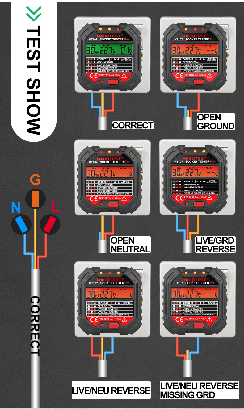 Спецификация: Бренд: HABOTEST Тип: тестер розеток Модель: HT107D и HT107E Материал: ABS Стандарт штепсельной вилки: штепсельная вилка европейского и британского стандарта (опционально) Диапазон фазного напряжения: 90 ~ 250 В/45 ~ 65 Гц Диапазон измерения напряжения утечки: 0 ~ 99 в/45 ~ 65 Гц Точность: ±(2.0% + 2) Тест RCD: Да (>30 мА) Диапазон рабочего напряжения RCD: 220 В ± 20 в ЖК-дисплей: Да Подсветка: Да Обнаружение подключения розетки: ● Правильное подключение ● Открытый грунт ● Открытый нейтральный ● Открытый прямой эфир ● Обратный провод под напряжением и провод заземления ● Провод под напряжением и нейтральный провод обратный ● Провод под напряжением и провод заземления обратный, отсутствует провод заземления Вес: около 50 г Размер: 68 мм x 65 мм x 63 мм
