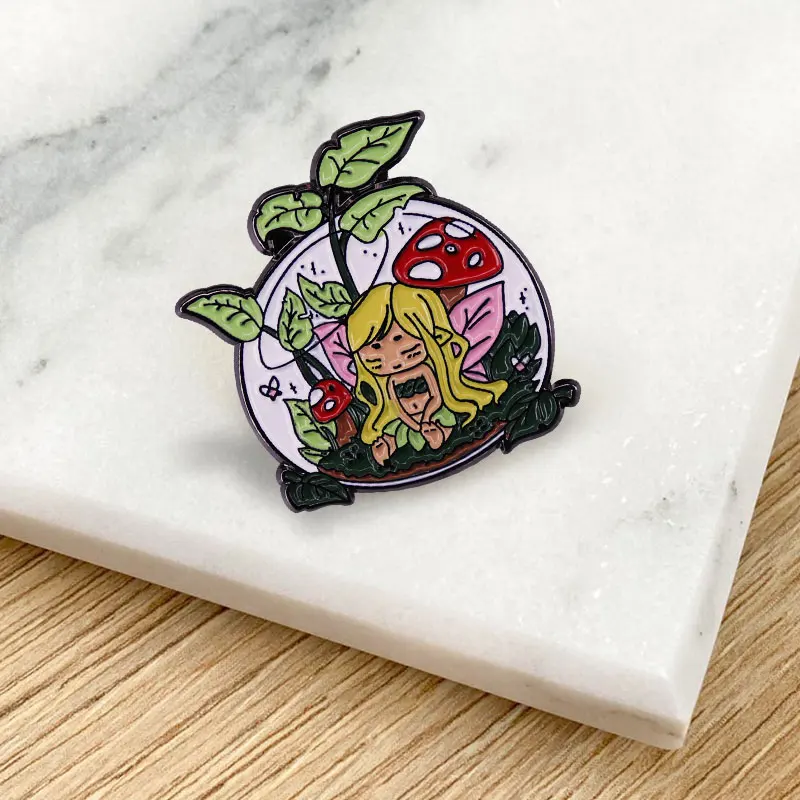 Эмалированная булавка с милыми бабочками, волшебным лесом, эльфом в росе, волшебная, натуральная, весенняя, спиртовая, листья, грибы, девочка, земляные эльфы, значок, брошь