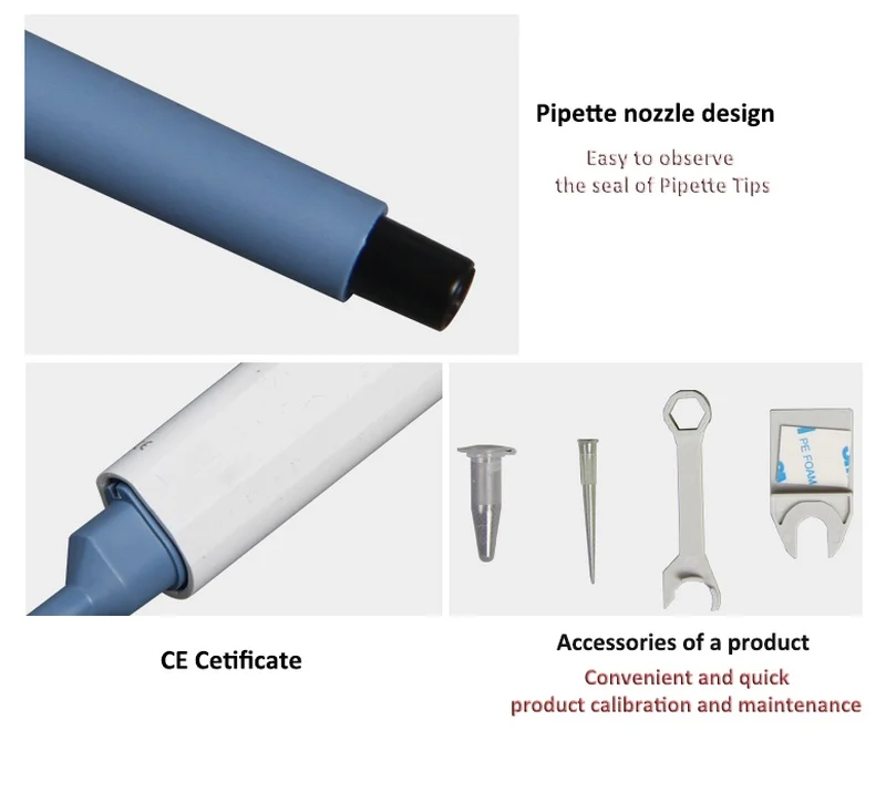 1. Легкий, эргономичный, низкий силовой дизайн.2. Цифровой дисплей четко читает настройки громкости.3. Пипетки охватывают диапазон объема от 0,1мкл до 10 мл.4. Легко калибровать и поддерживать с помощью поставляемого инструмента.5. Конструкция помогает избежать повторяющихся травм напряжения.6. Калибровка в соответствии с ISO8655. Каждая пипетка поставляется с индивидуальным тестовым сертификатом.7. Низкая часть доступна для автоклава.