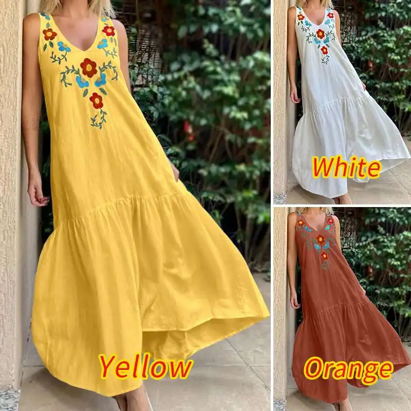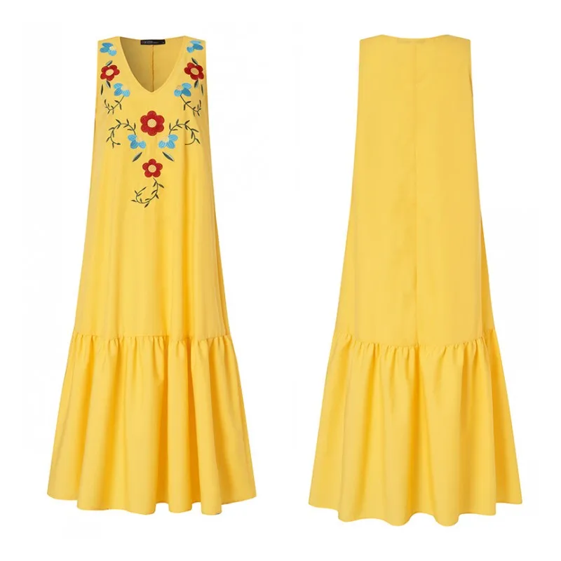 Женский сарафан без рукавов, с цветочной вышивкой и V-образным вырезом