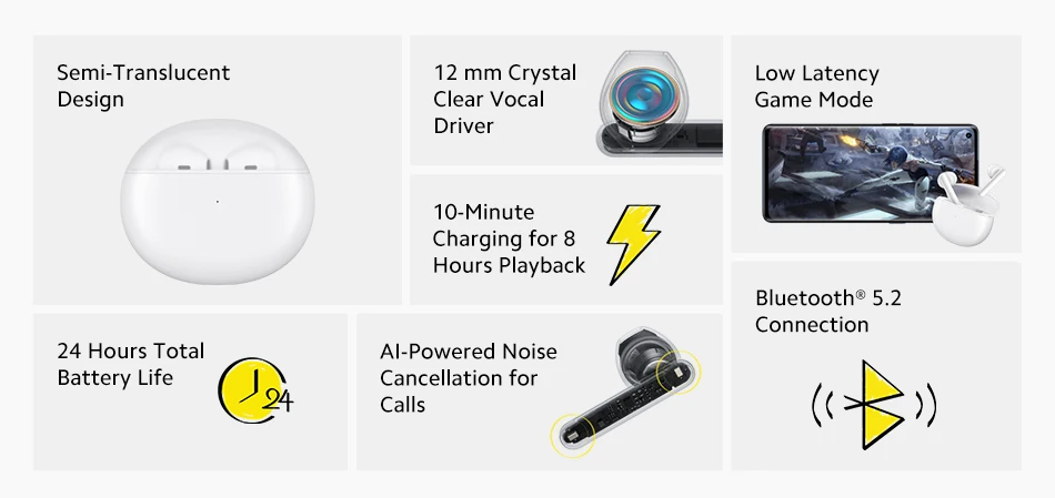 24 часа автономной работы10-минутная зарядка за 8 часов воспроизведенияПолупрозрачный дизайн12 мм кристально чистый вокальный драйвер