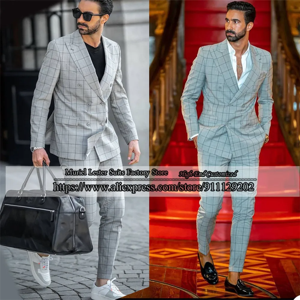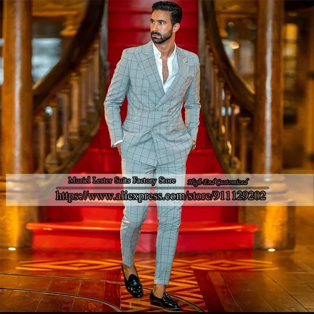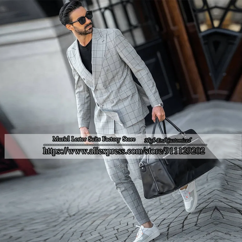 Мужской костюм из 2 предметов, светло-серый клетчатый официальный Свадебный Смокинг на заказ, двубортный Высококачественный хлопковый деловой пиджак + брюки