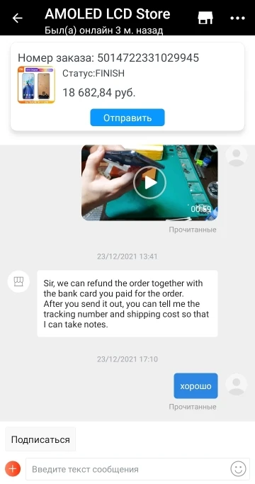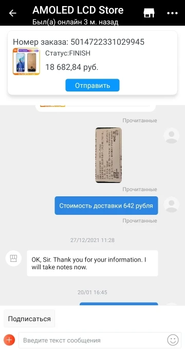 Возмущению нет предела.Заказал дисплей 11.11.2021,скидка хорошая была,дисплей дорогой.Дисплей пришёл достаточно быстро.Но счастье моё длилось не долго.На алиэкспресс заказываю достаточно давно,опыт есть, каких либо проблем никогда не было.Пока не заказал дисплей у этого продавца,хорошо,что снял видео распаковки дисплея и его подключение и всем рекомендую обязательно это делать.Дисплей не включился,я открыл спор.Месяц продавец убеждал меня,что надо обратиться к специалистам,присылал бесполезные видео,как подключить дисплей.Я занимаюсь ремонтом больше пяти лет, 4 из них я занимаюсь переклейкой.Сотрудничаю с TBK несколько лет.Я уверен,что дисплей не рабочий,но продавец так не считал и обвинял меня в не профессионализме.Я предоставил кучу видео доказательств, включая видео под микроскопом,от продавца только непонятные картинки с китайскими иероглифами.По решению алиэкспрес,я отправил товар.26 февраля 2022-жду деньги за товар,за доставку продавец отказывается возвращать деньги.Делайте вывод