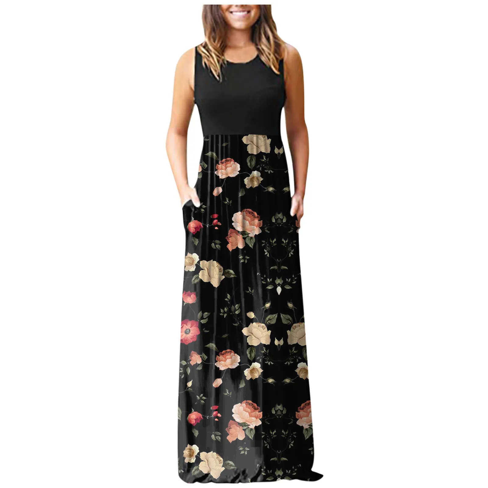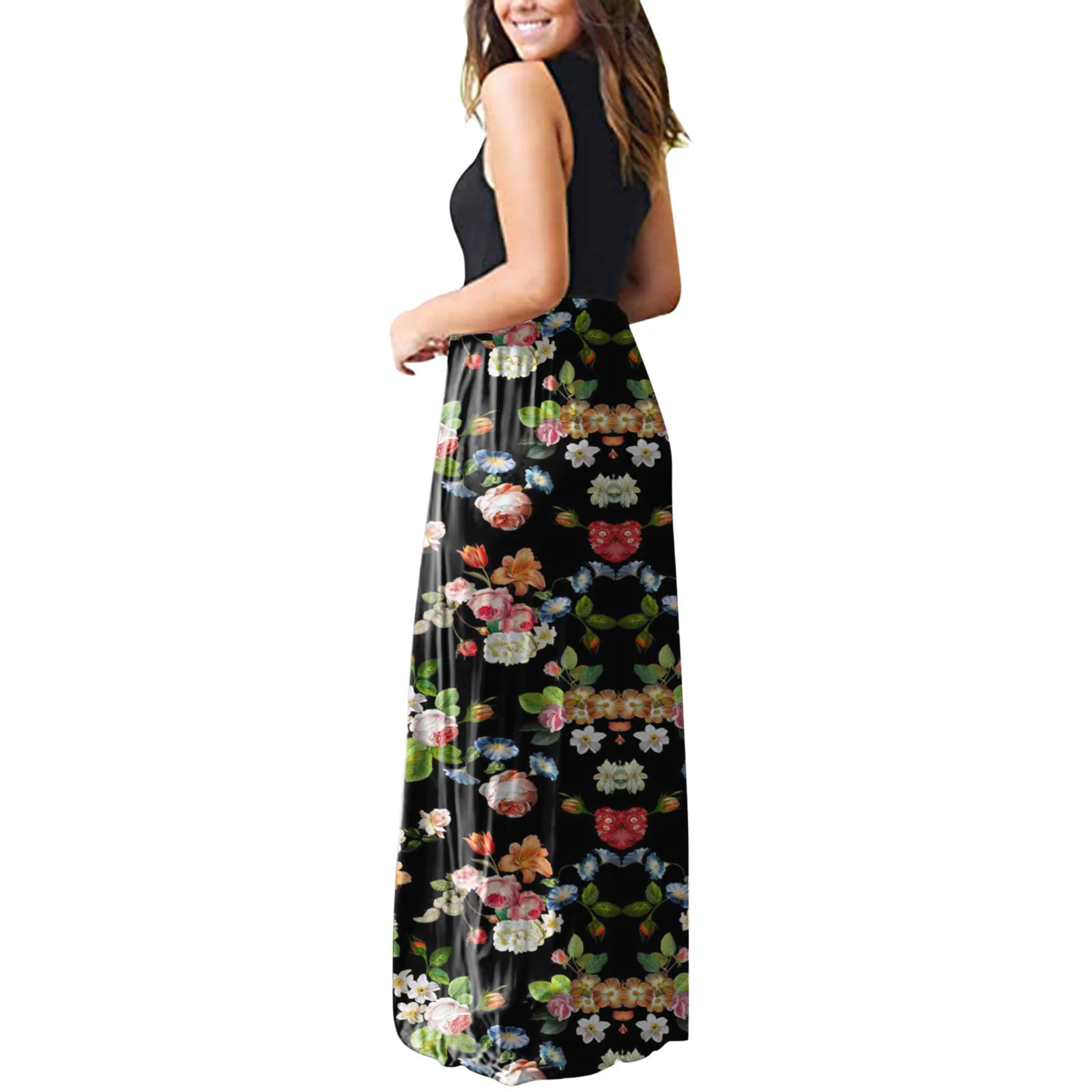 Женское свободное пляжное платье макси без рукавов с карманом и цветочным принтом