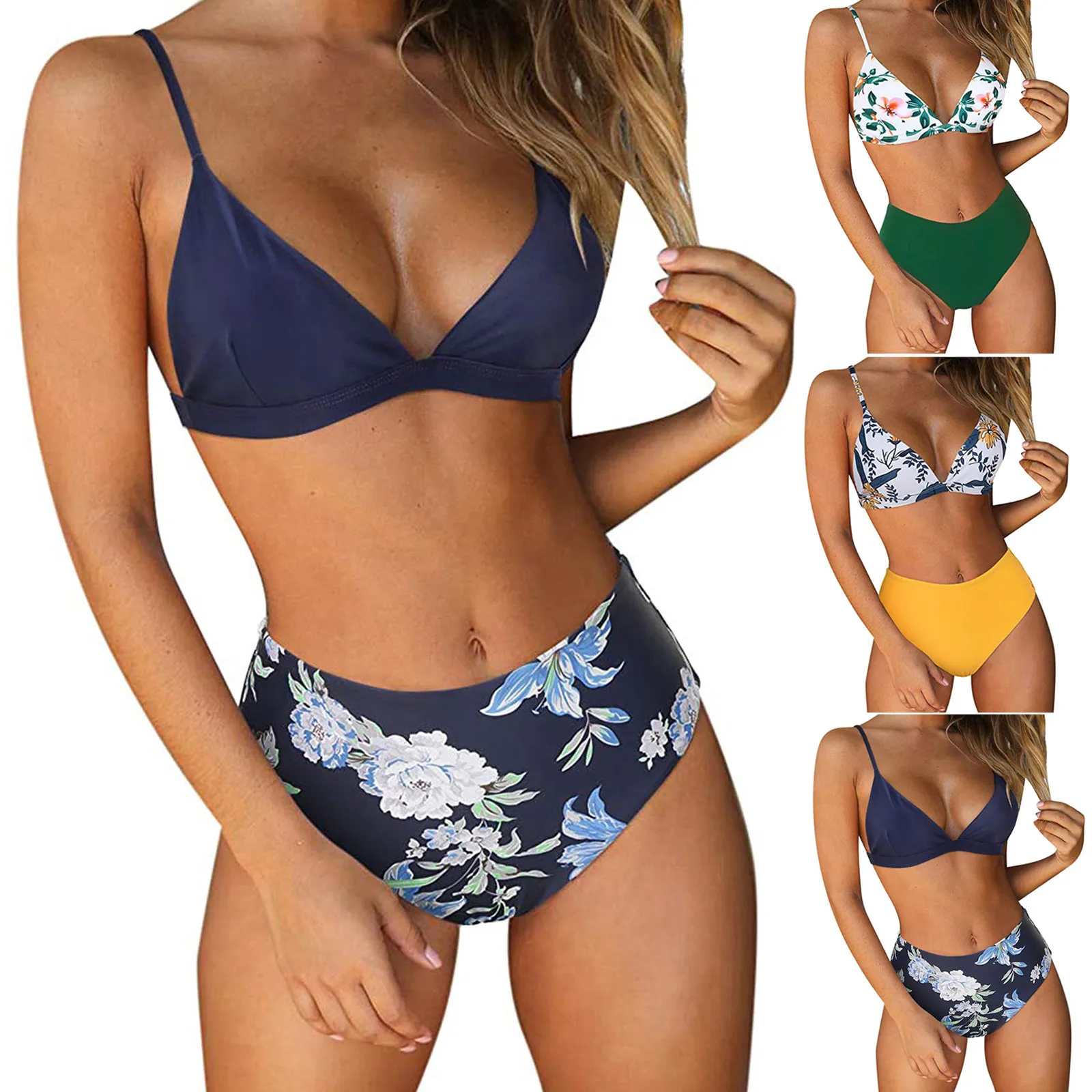 Зеленые и цветочные сексуальные комплекты бикини с высокой талией, ...