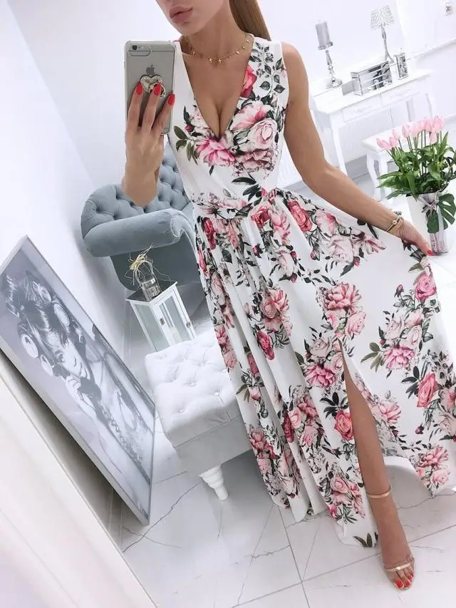 Летнее женское платье без рукавов с цветочным рисунком Макси платье сексуальный разрез Бохо пляжное белый Платье без рукавов 2021 элегантное сексуальное нижнее белье с глубоким v-образным вырезом и принтом вечерние Открытое платье без рукавов