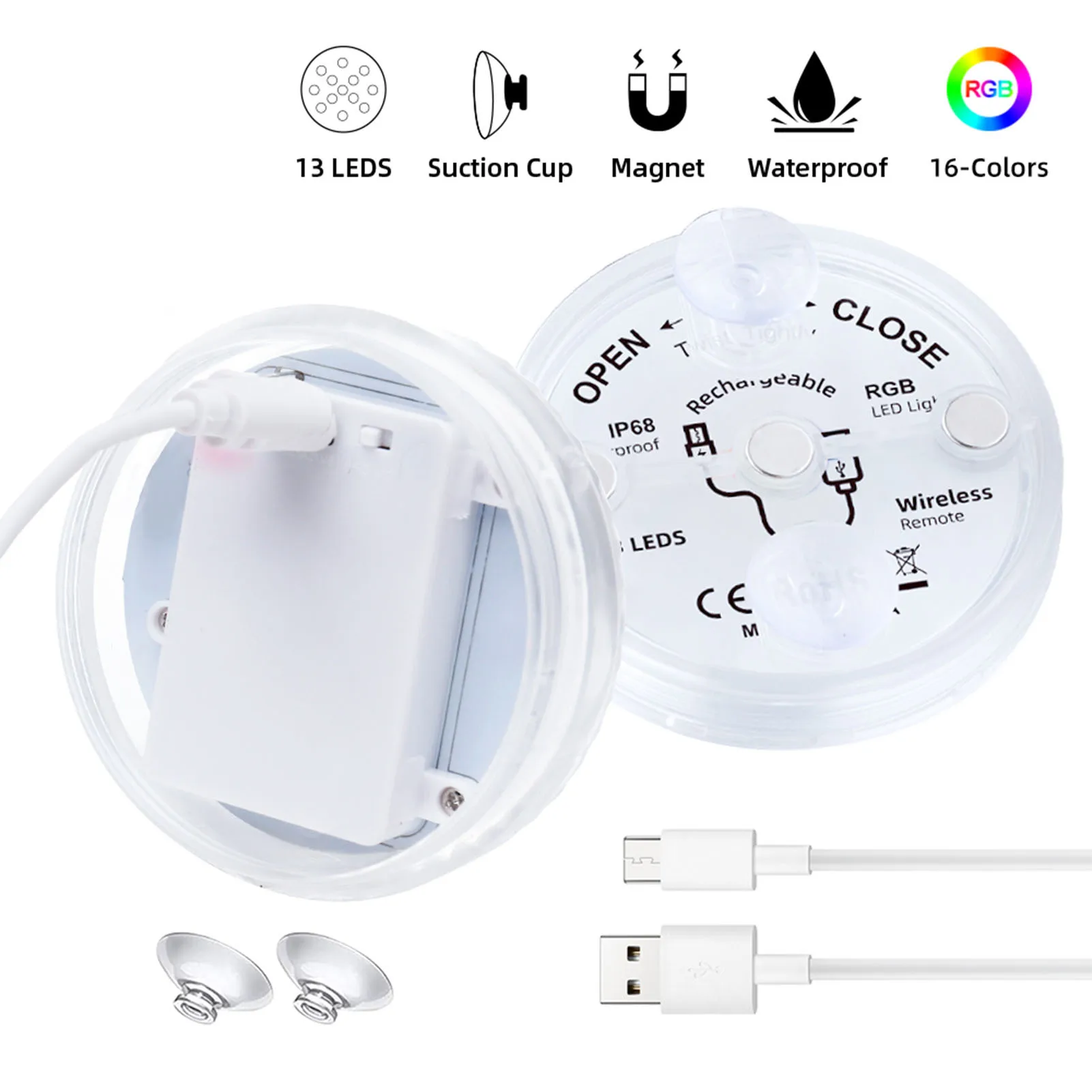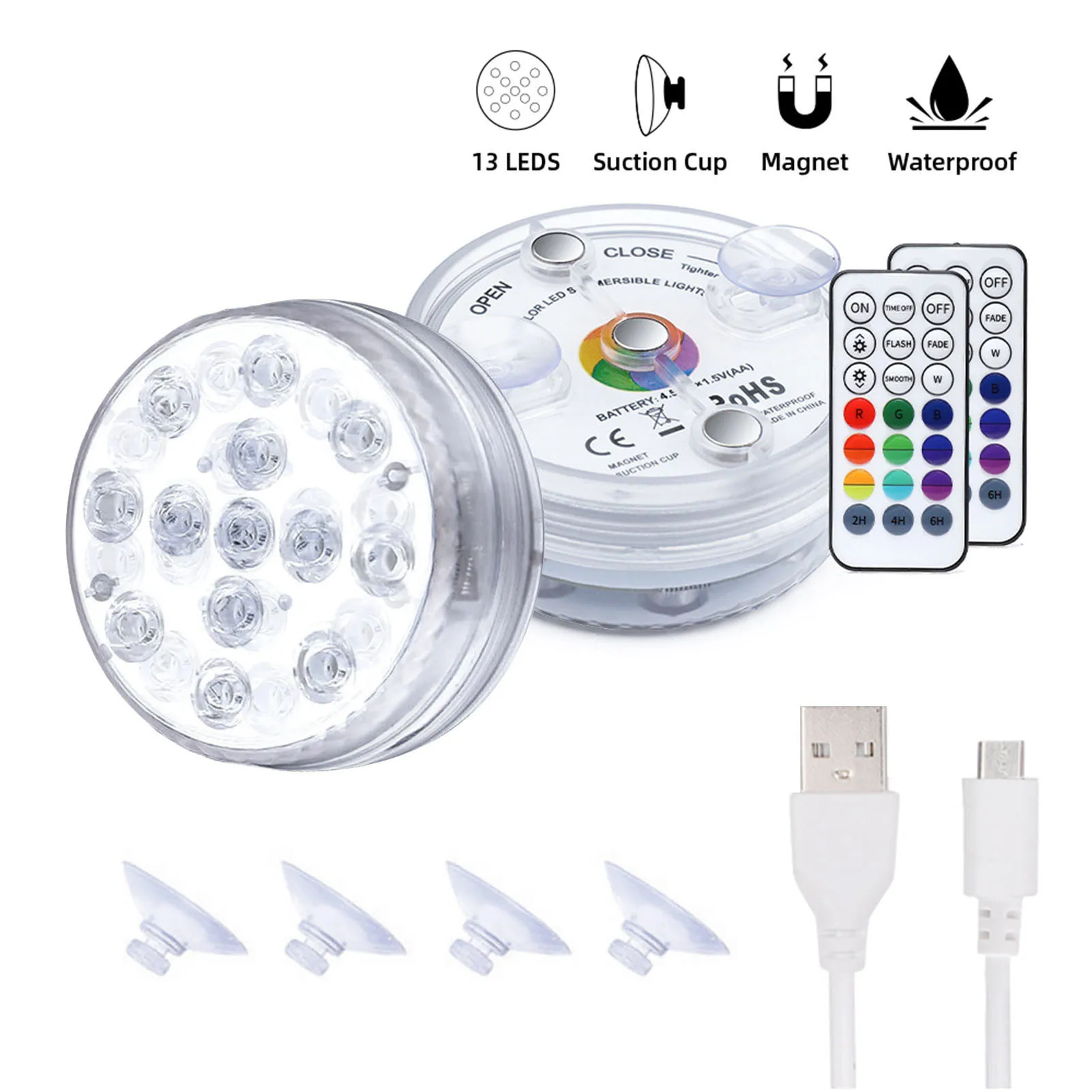 2 、 высокого качества светильник источник: 13 высокая яркость полноцветная светодиодов, 7 см в диаметре, 16 видов цветов, 3 светильник ing режимов, подходит для плавательных бассейнов, аквариумов, фонтанов, аквариумы, украшение дома и светильник.