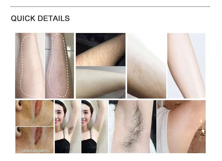 1. Постоянное Удаление нежелательных волос всех частей тела, таких как лицо, подмышка, спина, ноги и линии бикини и т. Д., и удаление всех видов глубоких волос.