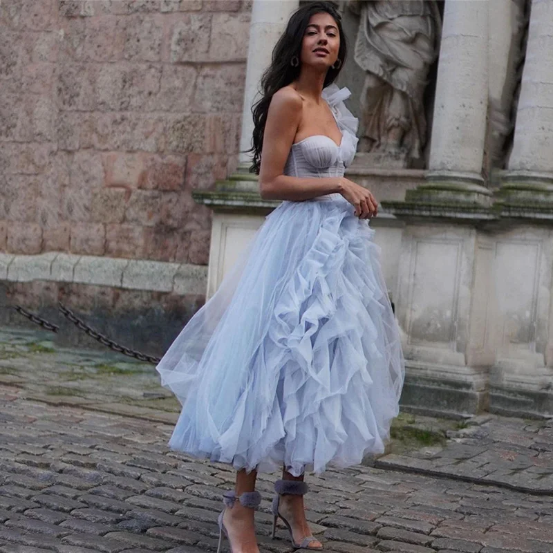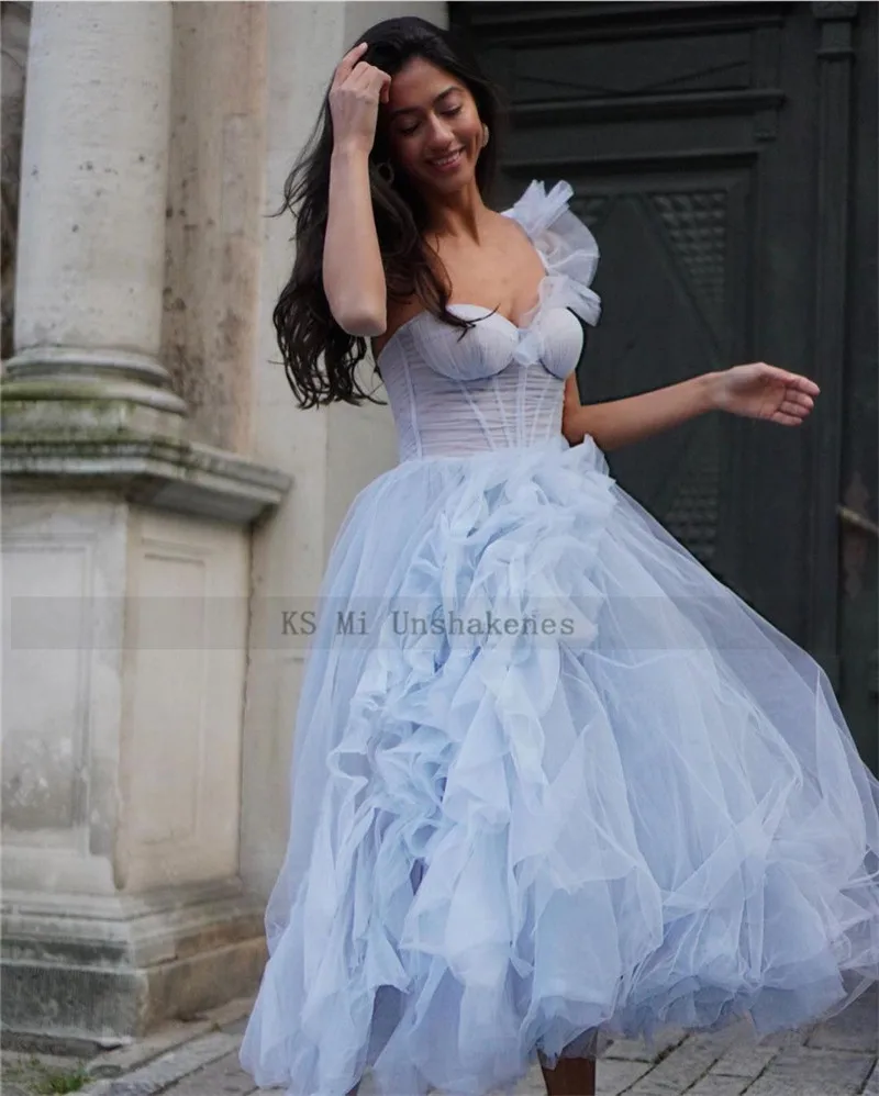 Детские синие короткие платья для выпускного вечера, платье на одно плечо, формат 2021, до колена, платье для встречи выпускников, с оборками, женское свадебное платье