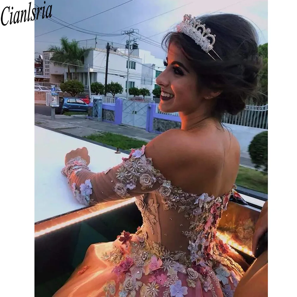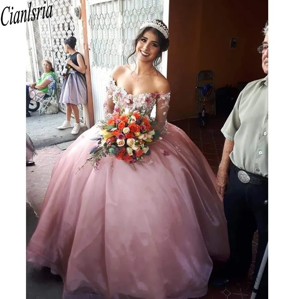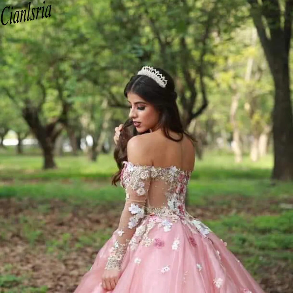 Румяна розовые 3D цветочные платья Quinceanera 2021 блестящие тюлев...