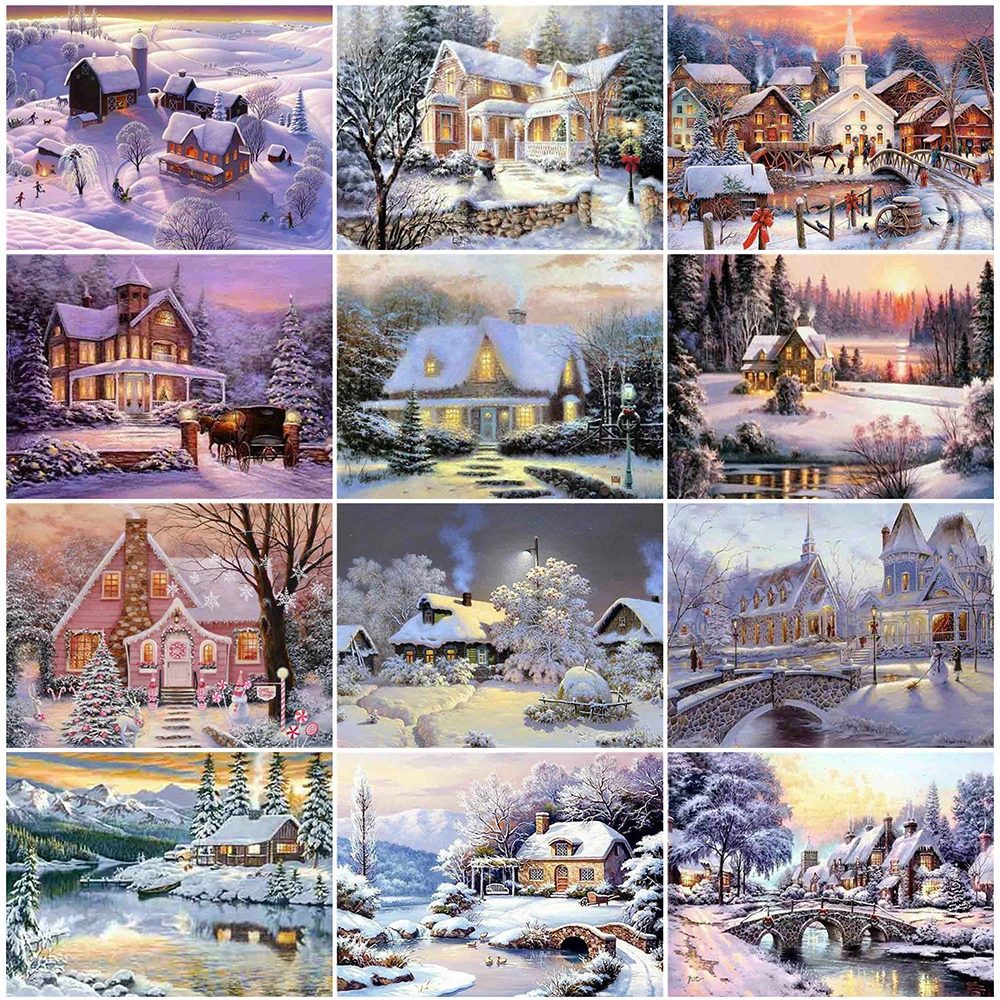 5D алмазная вышивка сделай сам, зимний дом, алмазная живопись, полный квадраткруглый пейзаж, картина Стразы, вышивка бисером