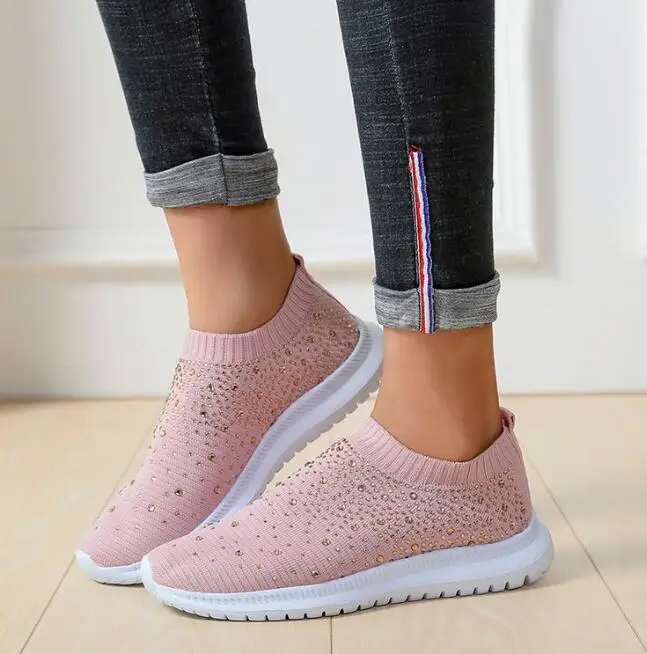 Кроссовки женские, дышащие, со стразами, до щиколотки, обувь на пло...