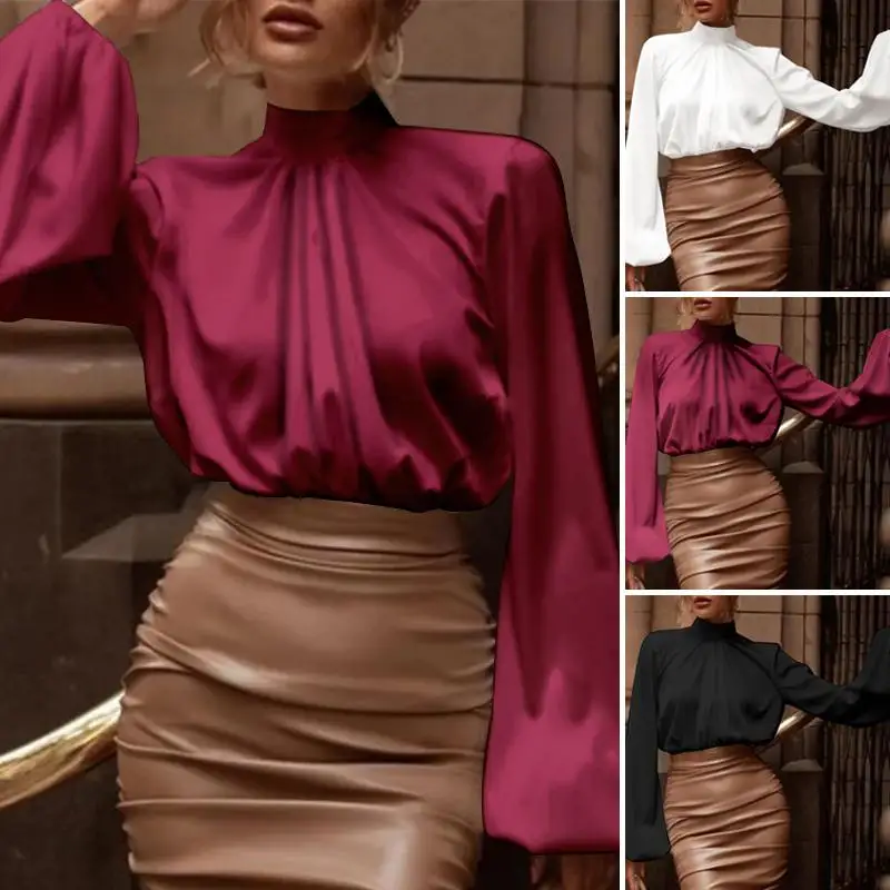 2022 Модные женские атласные блузки Celmia Элегантная туника с высоким воротником Роскошные однотонные шелковые рубашки блузки с рукавами-фонариками для женщин