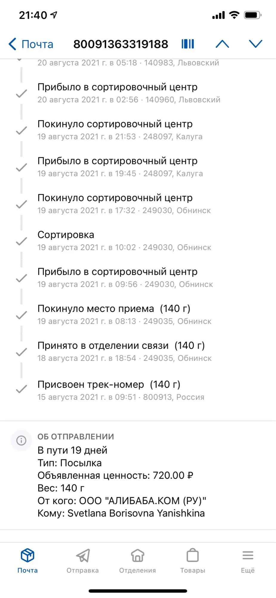 Жду этот товар до сих пор, сегодня 6.09.21, заказ был сделан в начале августа, очень странно почему статус заказа самостоятельно поменялся на «Отзывы», ещё вчера о нем была информация - «Заказ отправлен» и кстати я его ещё отслеживаю на сайте Почта России, где есть последнее сообщение о перемещении посылки - «Покинул сортировочный центр Владивосток 31 августа 2021 г», без сомнений происходит какой-то обман или ошибка. Прошу разобраться и доставить мне мой заказ. В связи с тем, что у заказа искусственным способом изменён статус, не могу зайти под его изначальным трек номером и написать претензию и я не делала отметку о его прибытии, потому что его не получала, номер моего заказа на Почта России 80091363319188. Пришлось оценивать услугу, поставила одну звезду, так как моя претензия к поставщику не отправлялась без всех этих заполненных ячеек, требовались все параметры оценки)), воспринимайте их большим минусом, и пока анонимно...