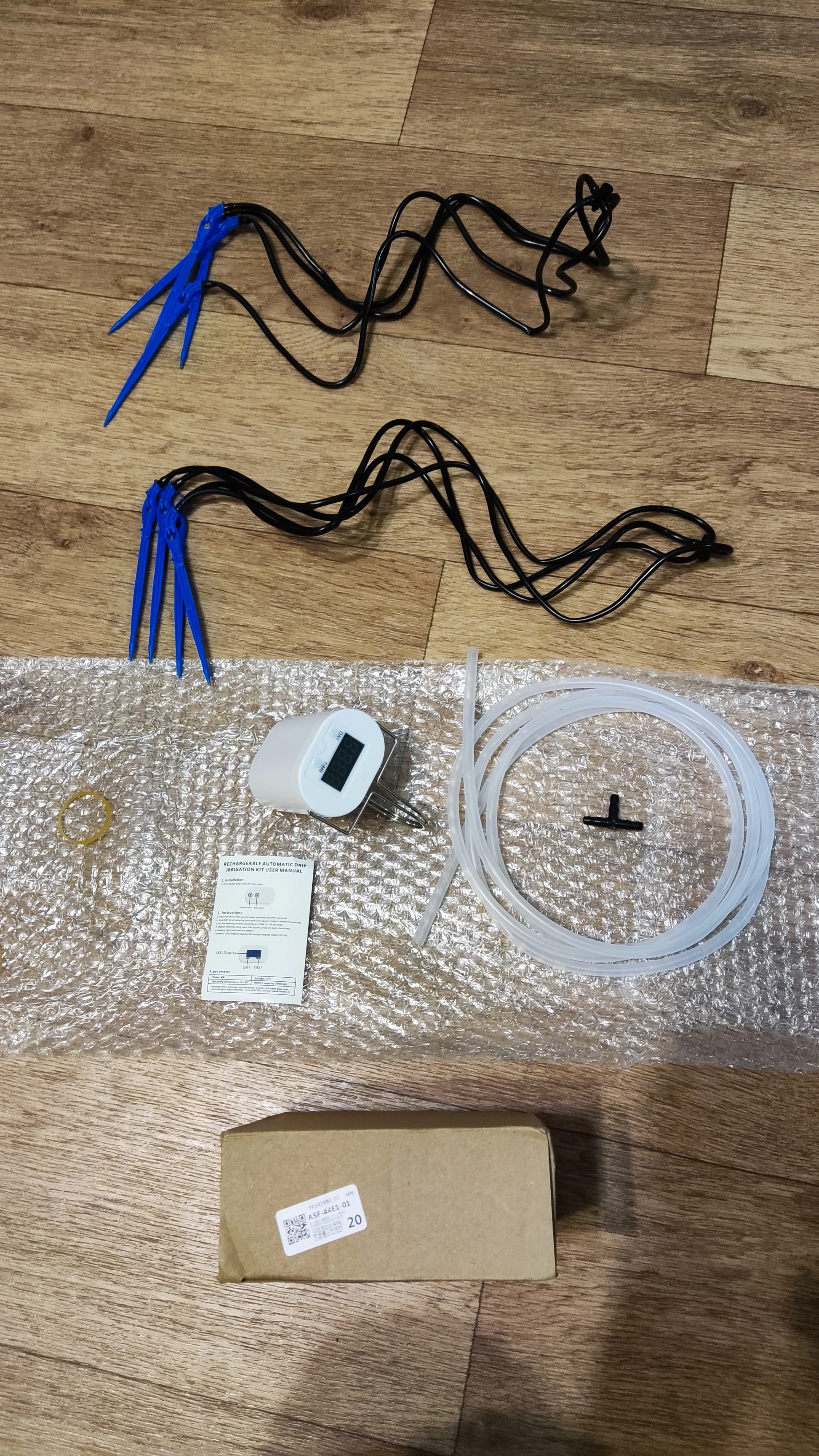 Контроллер * 1, спринклер * 2, тройник * 1, крючок * 1, водопровод *