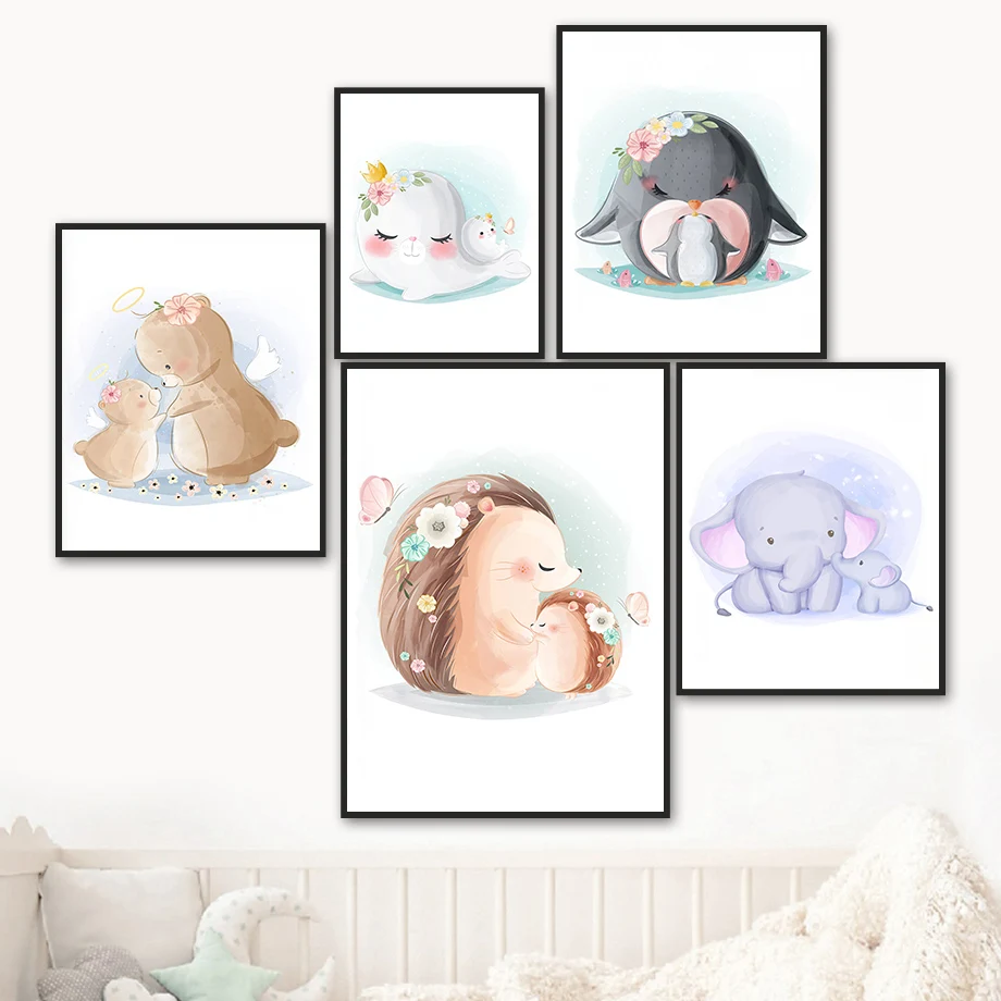 Постеры и принты в скандинавском стиле с изображением слона медведя кролика пингвина ежика, Настенная живопись на холсте, настенные картины, декор для детской комнаты