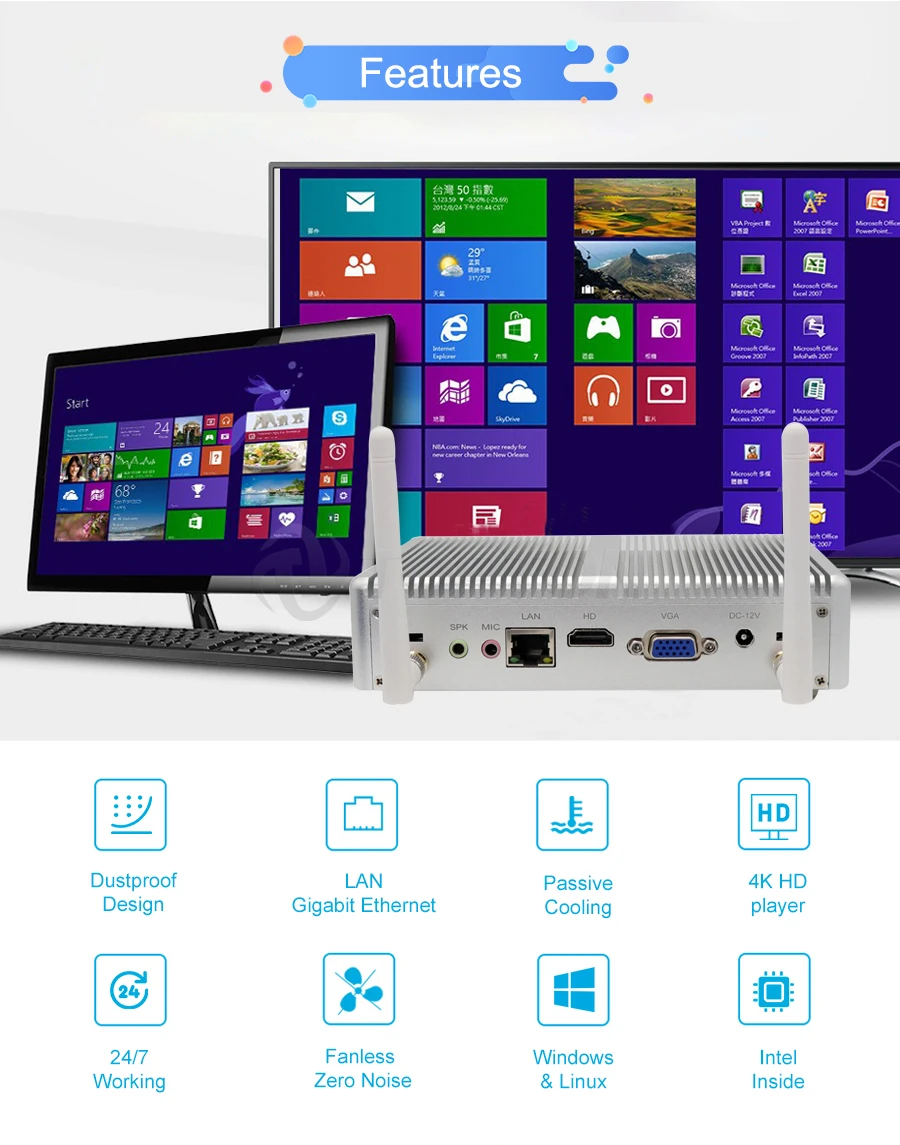 7)-сильная работа с любыми брендовыми мониторами; 1 * гигабитная Lan Nics + + 1 * HDMI + 1 * VGA + 4 * USB3.0 + 2 * USB2.0 подходит для нескольких приложений, например, интеграция с сенсорными устройствами, промышленными предприятиями, магазинами по ремонту автомобилей, безопасности, образование, дома, как HTPC, бизнес, fanancial и проекты;