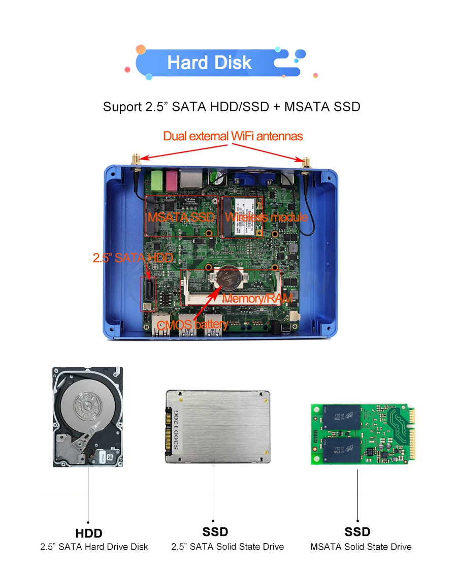Поддержка Intstall 1 * mSATA SSD и 1*2,5 дюймов SATA HDD / SSD
