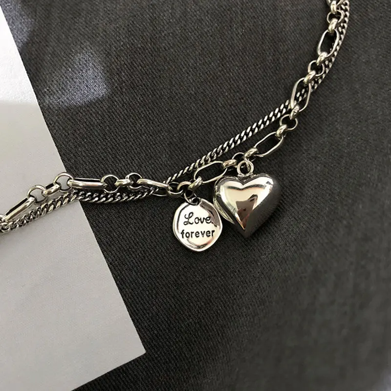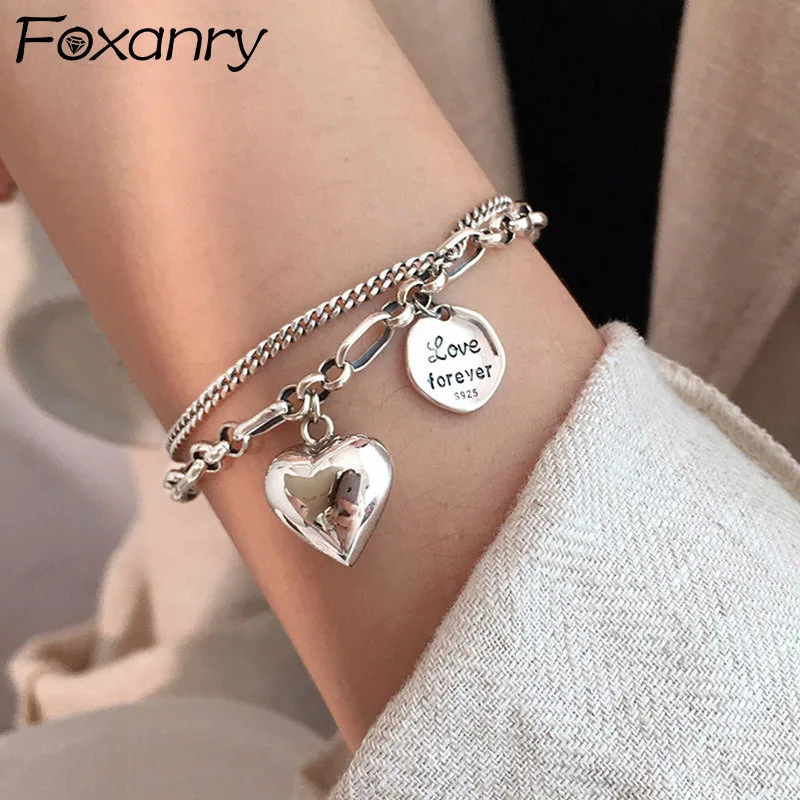 Foxanry 925 стерлингового серебра браслет новая мода в винтажном панковском стиле; Милые для влюбленных пар с двойной цепью любящее сердце Ювелирные изделия Подарки для женщин