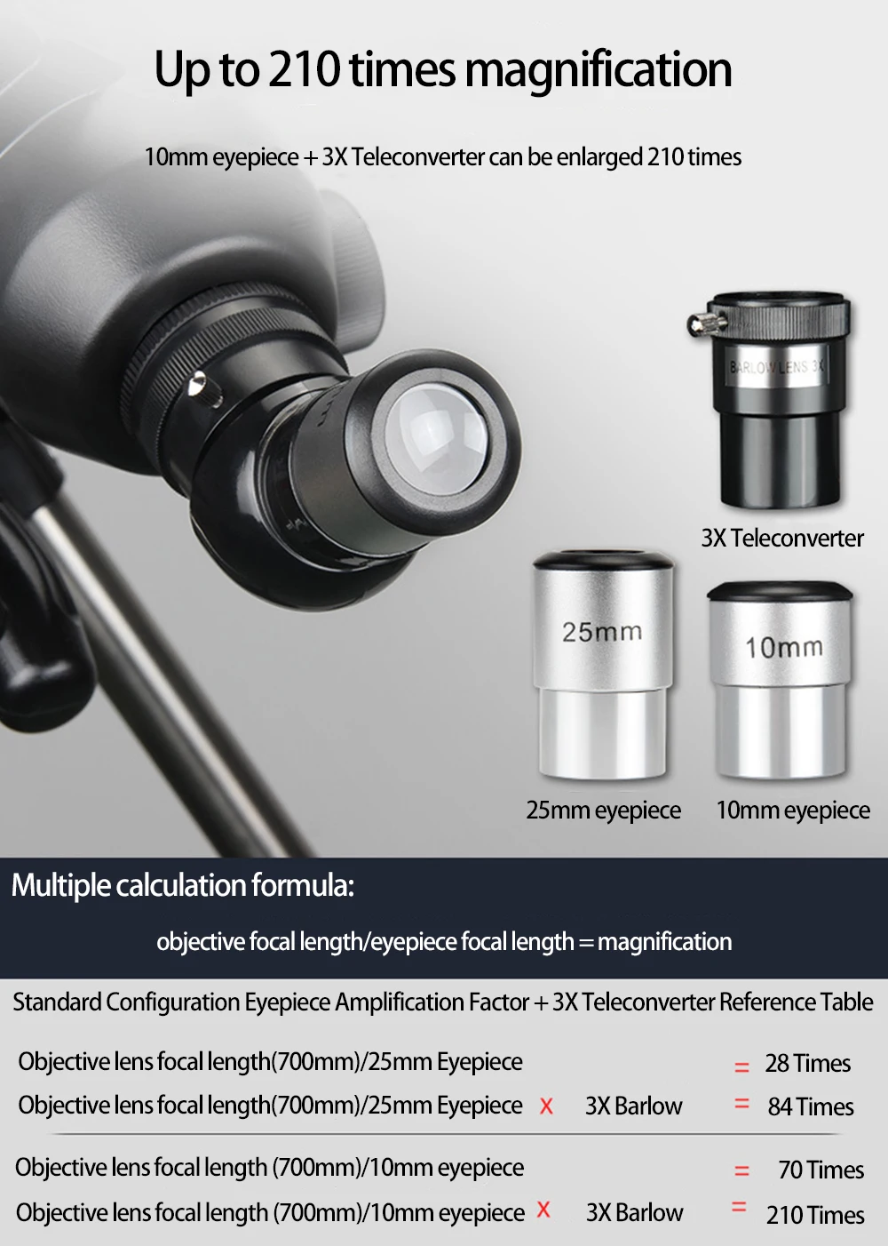 Профессиональный астрономический телескопУвеличение: 150XДиаметр объектива: 70 ммОкуляры: 20 мм, 10 ммМатериал: высококачественный алюминиевый сплав