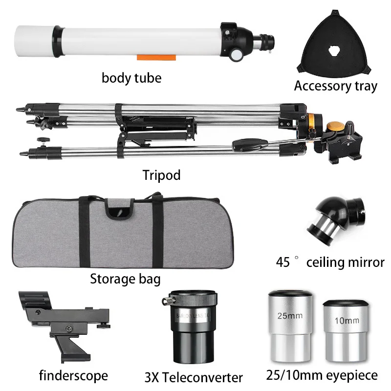 1. Телескоп2. Сумка для хранения3. Штатив4. Два окуляра5,3 раз объектив6. ФиндерскопПотолочное зеркало 7,45 °8. Лоток для аксессуаров