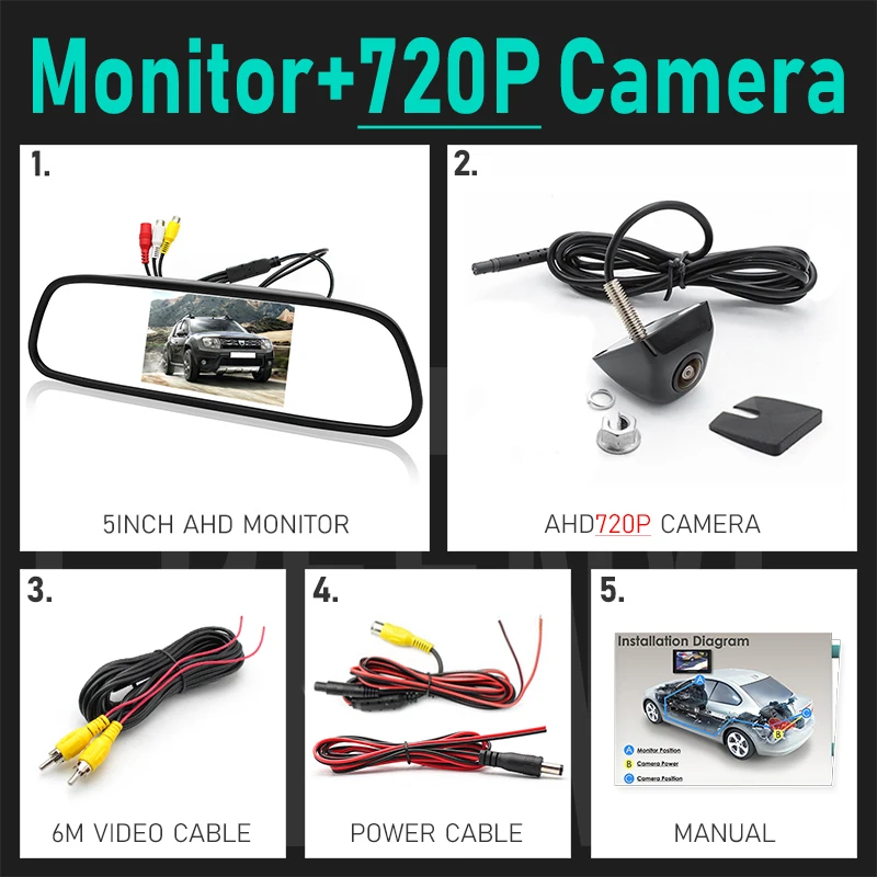 1 x 5-дюймовый зеркальный монитор AHD1 траекторная камера AHD1 х 6 м видеокабель1 x Кабель питания 1,5 м1 х Самонарезающий винт1 x регулировка угла