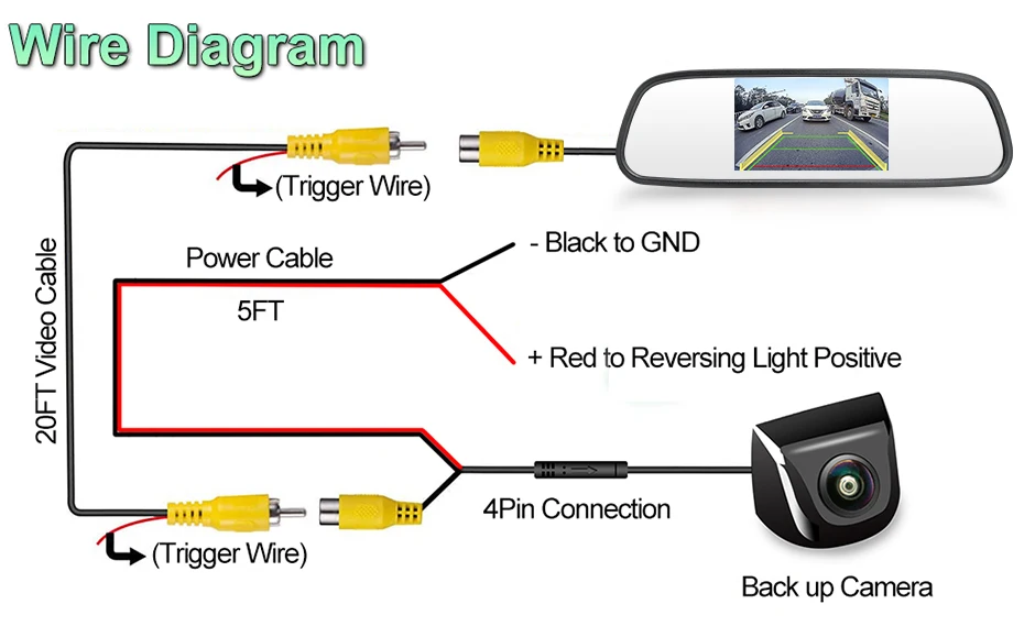 1. Найдите плоскую поверхность (параллельную земле) для крепления камеры, затем закрепите гайку и болт на месте.2. Подключите кабель питания к источнику питания заднего хода.3. Подключите 6-метровый Удлинительный провод резервной камеры к Головному Устройству/другим мониторам вашего автомобиля.4. Запустите автомобиль и передачу на задний ход, чтобы проверить камеру.5. Повторно установите головное устройство/другие мониторы.