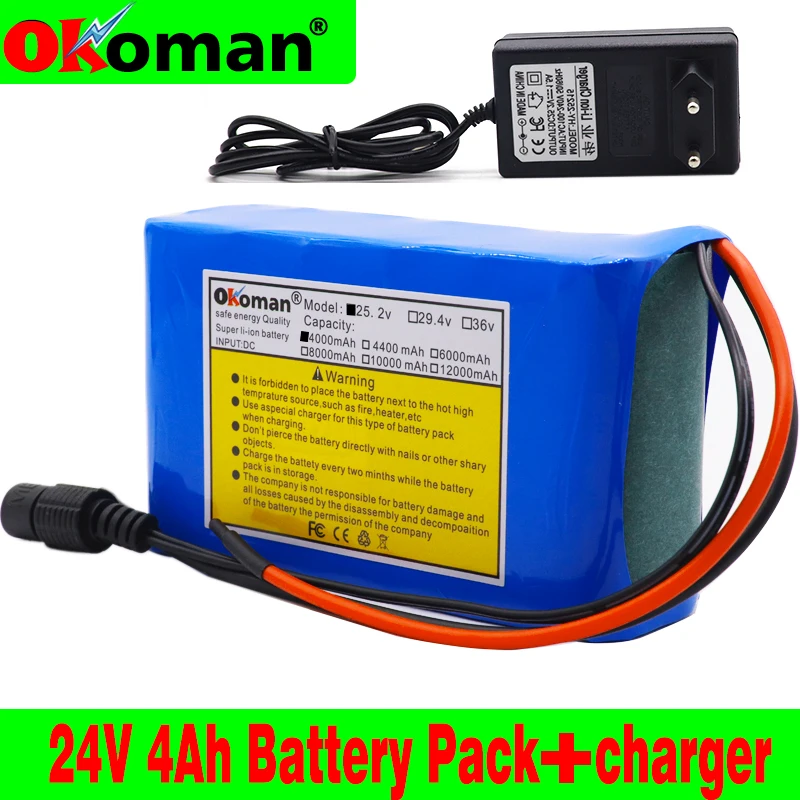 Высокое качество 6s2p литий-ионный аккумулятор 24V 4Ah 18650 25,2 v 4000mAh литий-ионный аккумулятор для электрического мопеда велосипеда + зарядное устройствоТехнические параметры батареи:Параметры продукта:Бренд: OkomanНоминальное напряжение: 24 ВВходное напряжение: 25,2 вВыход напряжение: 16,5-25,2 VЕмкость аккумулятора: 4AhВнешний диаметр: 110*38*68 ммАвтоматическая батарея, перезарядка батареи, перезарядка, Перегрузка по токуЭффективно предотвращает внешние короткие замыкания.Упаковочный лист:1X2 4V аккумуляторная батарея1X зарядное устройство 25,2 вПримечание: зарядное устройство имеет два типа штекеров: европейские правила, правила США(Мы отправляем европейские правила по умолчанию, Соединенные Штаты отправляют нам правила, если вы хотите указать вилку, пожалуйста, оставьте сообщение или проконсультируйтесь с нами. Спасибо)