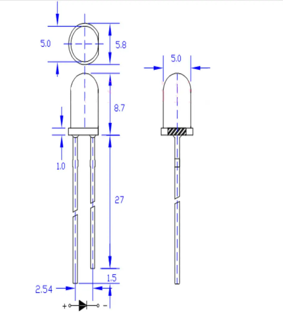 Особенности:В отличном состоянииДлительный срок службы (более 100000 часов)Низкое энергопотреблениеI.C. СовместимостьИнтенсивно яркийСпецификация:Количество: 100 шт./упаковкаОбъектив: диаметр 3 мм/5 мм/прозрачный/соломенная шляпаЦвет излучения: Фиолетовый УФ (395nm-400nm)Интенсивность света: 300-400mcd (это ультрафиолетовый светильник, поэтому он не очень яркий)Угол обзора: 120 градусовВперед Напряжение/ток: 3V-3,2 V | 20mAПолярность: анод (более длинная часть) | Катод (более короткая часть)Длина ноги: 16-18 мм (395нм) 4-6 нм (365нм)