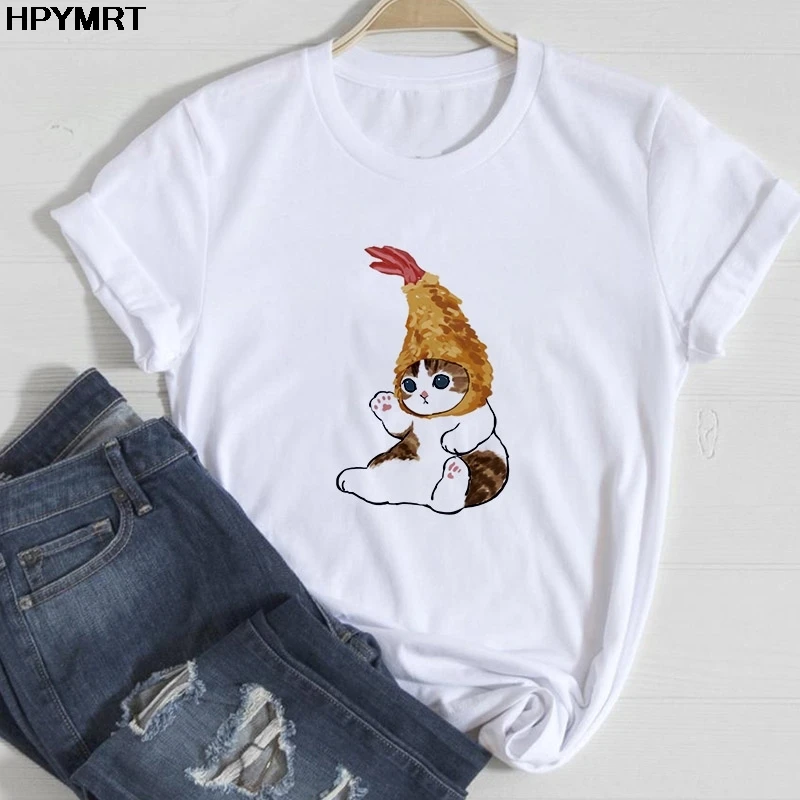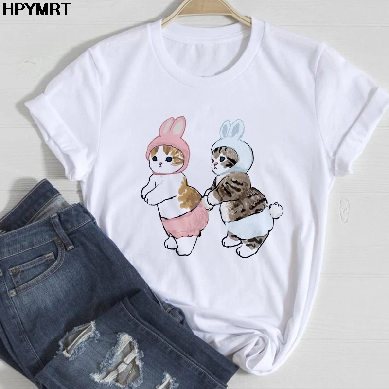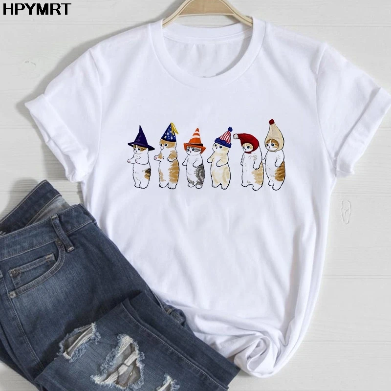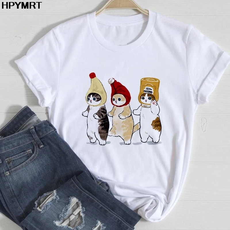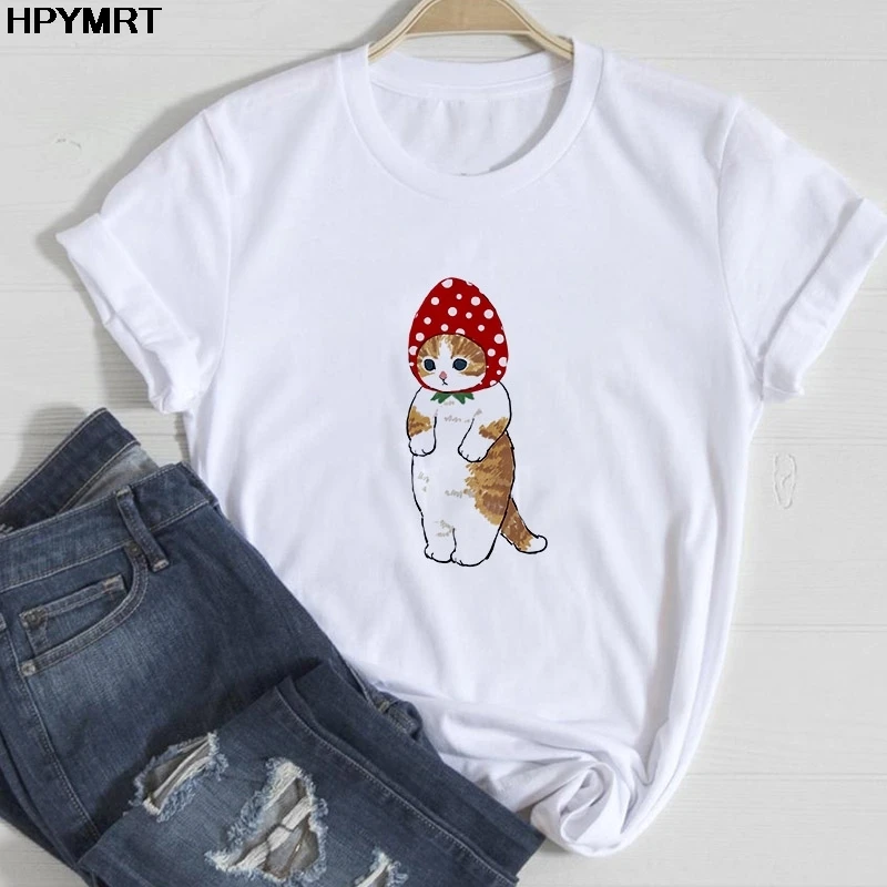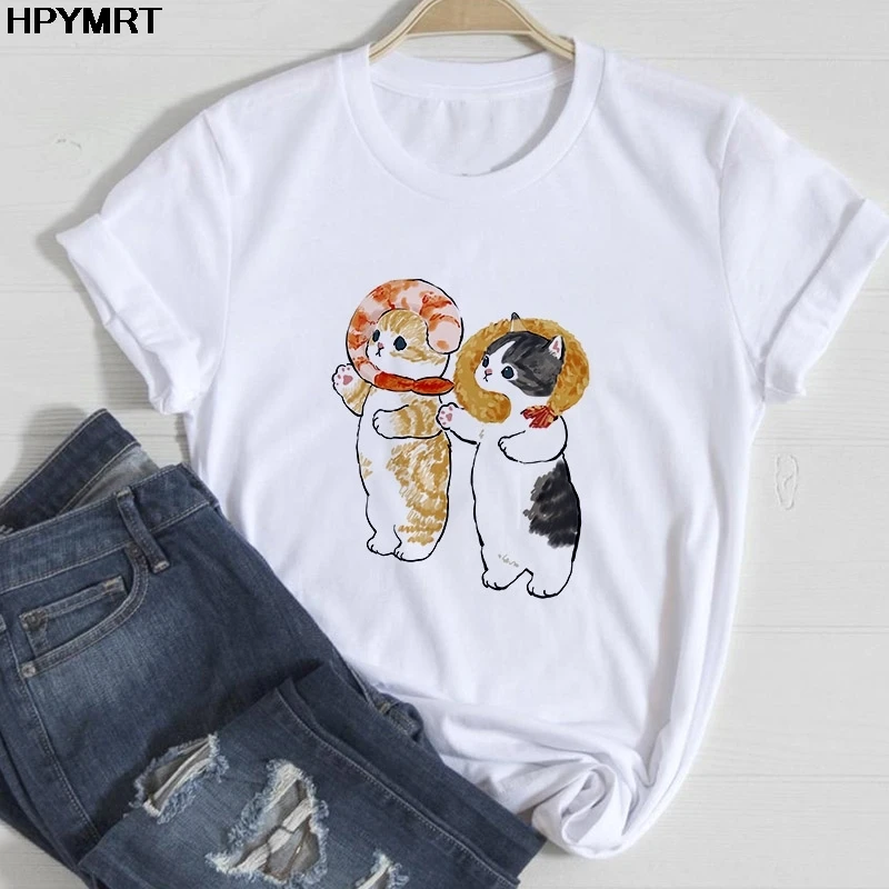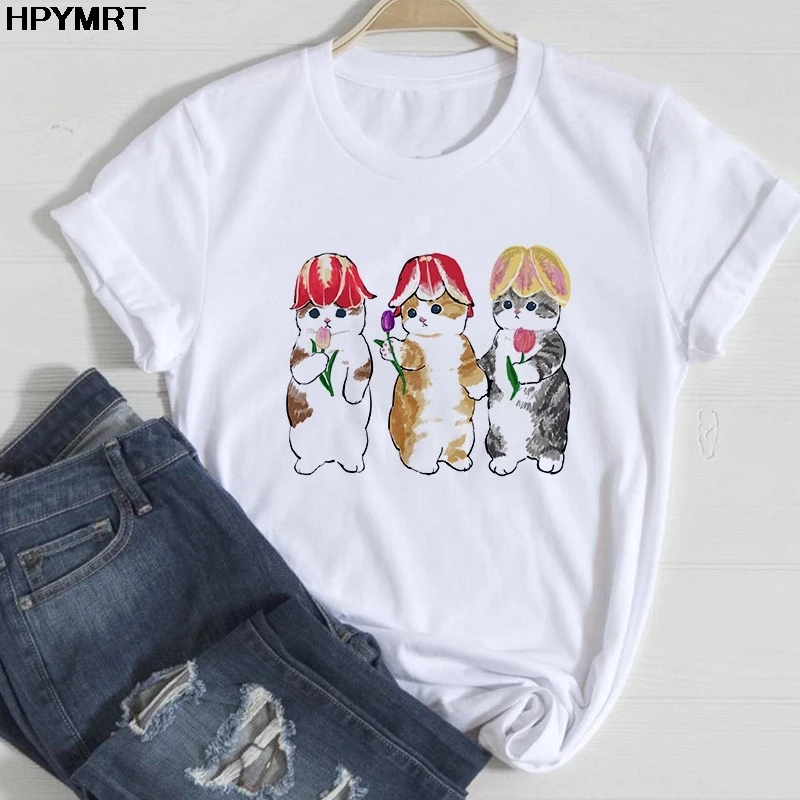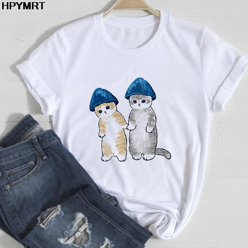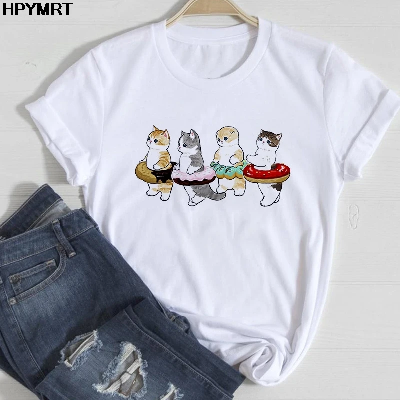 Женская футболка с принтом, летняя повседневная футболка с коротким рукавом и изображением кота в стиле 90-х