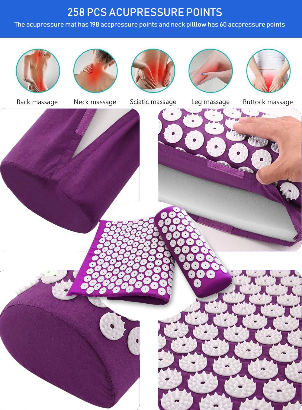 Размер изделияРазмер коврика appro.125cmx2cmx44cmРазмер подушки appro. 43 см x 10 см x 15 см360 массажные цветы-Материал: 100% хлопок + пена + пластик-Полезно для стимуляции точек акупрессуры и эффективности для снятия мышечного напряжения.-Идеальный инструмент, который позволит вам иметь все преимущества акупрессуры в вашем доме и привести вас в Глубокое расслабление.-Просто положите его на кровать или пол. Прост в использовании.-Легкий и портативный для переноски и хранения.-Применение: спа, семья, офис и т. Д.