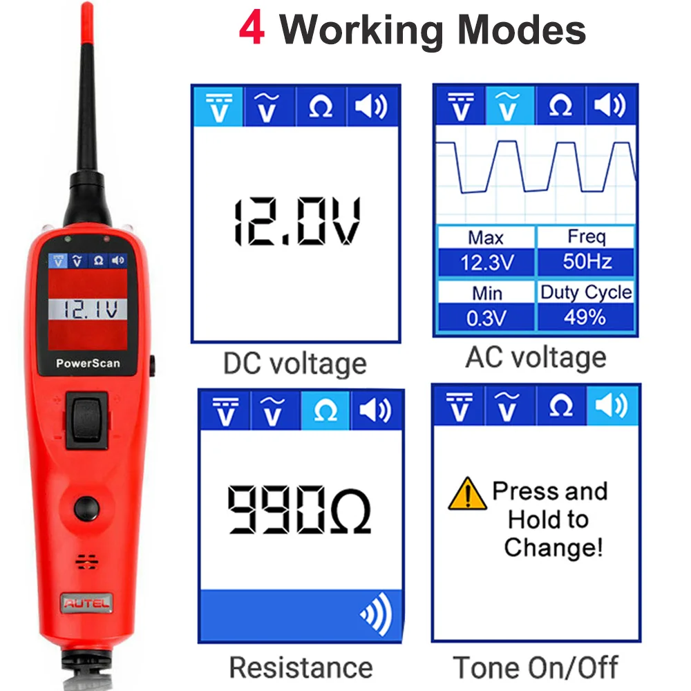 Autel PowerScan PS100 имеет четыре режима работы: напряжение постоянного тока, напряжение переменного тока, сопротивление и тон ВКЛ/ВЫКЛ.