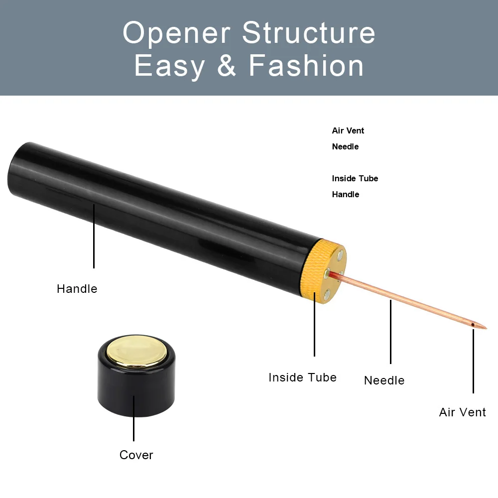 Чисто удалите любую пробку: по сравнению с традиционной пробкой винный пневматический штопор может очистить натуральную пробку и предотвратить загрязнение вина. Винной штопор использует острую металлическую иглу, которую можно аккуратно скользить в центр пробки для полной разборки.