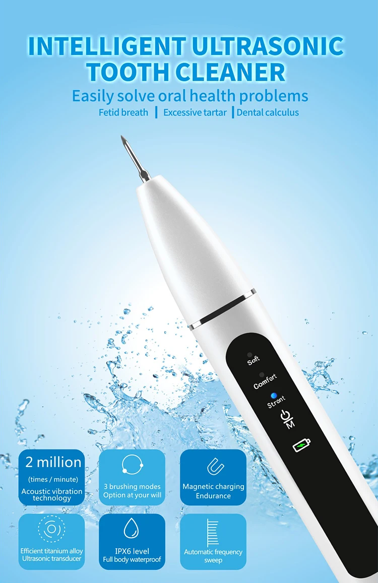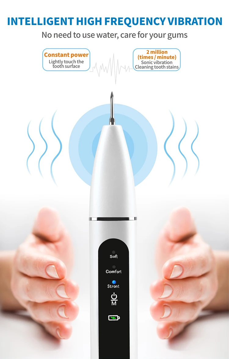 Звуковой очиститель зубов Особенности:①. Микроиндукционная ультразвуковая технология-электросистема магнитной левитации. Во время ультразвуковой работы, только когдаРабочий наконечник касается твердых предметов, таких как зубы и стоматологические камни, он будет вибрировать, а мягкие предметы, такие как десны, прекратятсяВибрация (для защиты десен);②. При удержании ручки вы не почувствуете вибрации. Явление горения во время эксплуатации является нормальным.Пожалуйста, будьте осторожны, чтобы не трогать десны в течение длительного времени;③. Эффективен для пятен табака, пятен чая, зубного налета, упрямых камней зубов;④. IPX6 полный корпус водонепроницаемый, супер длительный срок службы;⑤. Светодиодный светильник интегрирован в фюзеляж, с дизайном рабочей головки светильник, Он удобен и прост в использовании.Он освещает бактерии в слепой области зрения, которая может быстро найти проблемы во рту и эффективно справиться с ними.⑥. Ультразвуковой преобразователь, сверхвысокочастотный Вибрационный чистящий камень для зубов, удобный и эффективный;⑦ Световой индикатор. Медицинский рабочий наконечник, качество 304 нержавеющая сталь. Тонкий рабочий наконечник подходит для очистки между зубьями,Матовый плоский наконечник подходит для очистки стойких пятен на поверхности зуба;⑧. 3 режима являются необязательными, и Переключение режима может быть осуществлено путем касания их дважды.