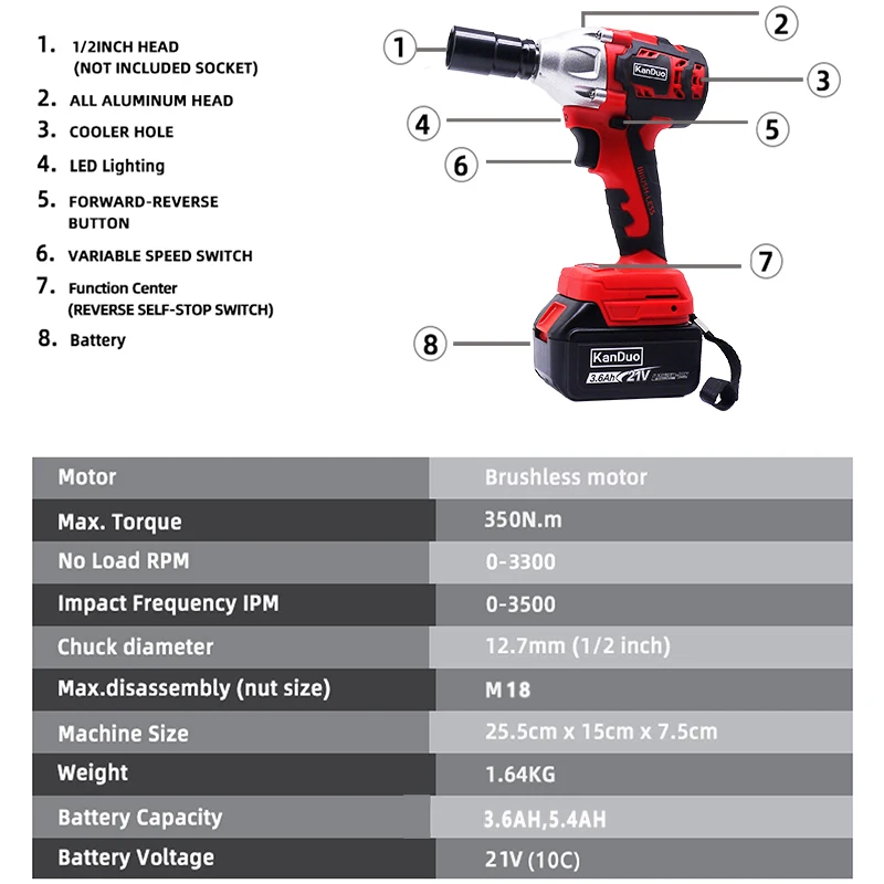 Перезаряжаемый гаечный ключ KANDUO, 21 в, Специальный беспроводной гаечный ключ на батарейках, 500 Н/м