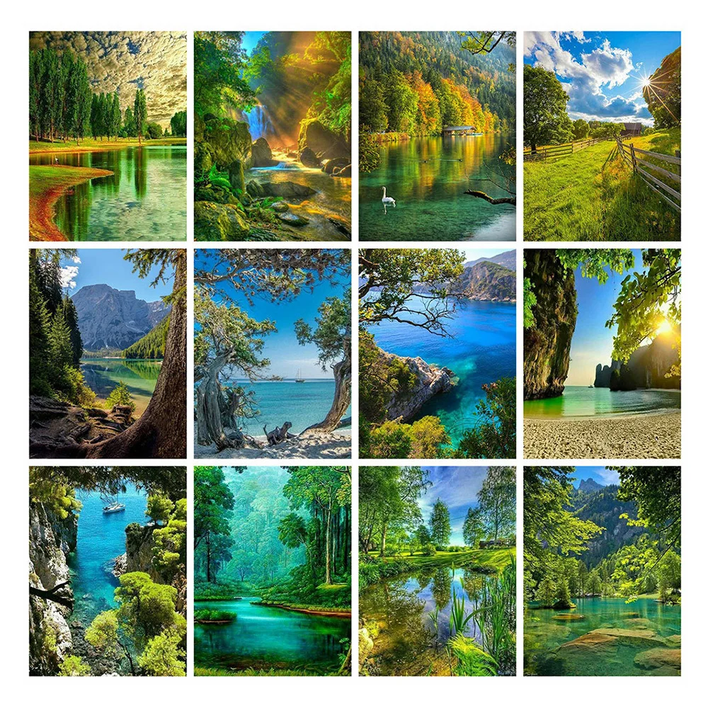 LZAIQIZG камни в форме ромбаНабор для рисования с круглыми камнями и полотном Картина Пейзаж Бриллиантовая вышивка с изображением дерева продажа речной Приморский Стразы украшения дома