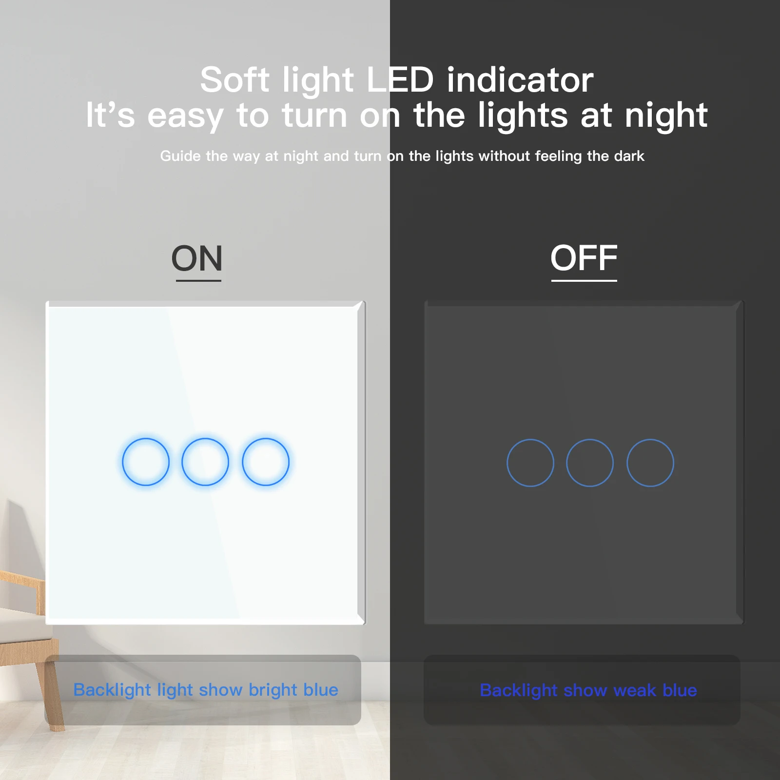 A:Синяя подсветка будет включаться, когда проводка пройдет успешно. Позволяет вам четко заметить наш сенсорный выключатель в темноте.